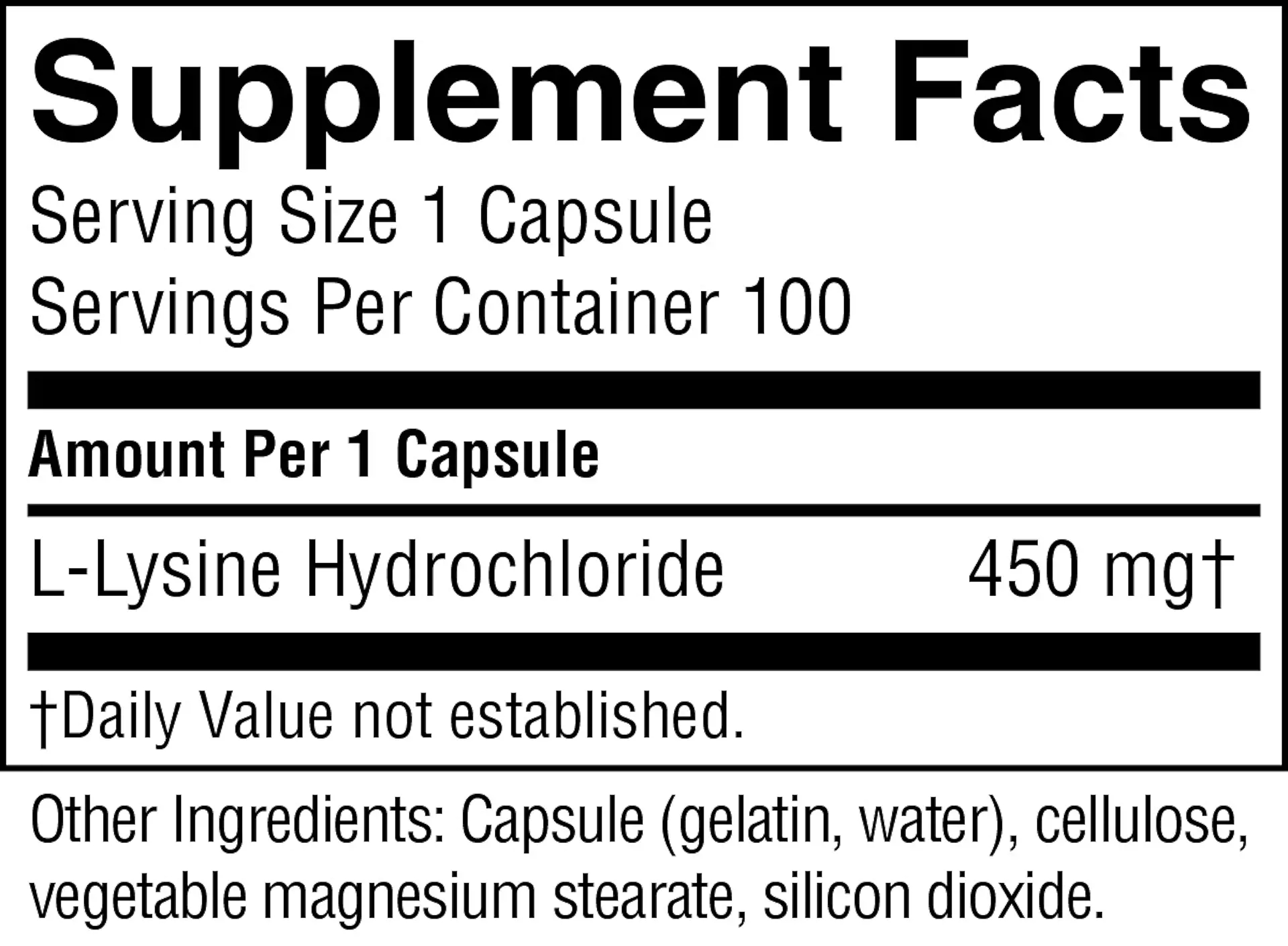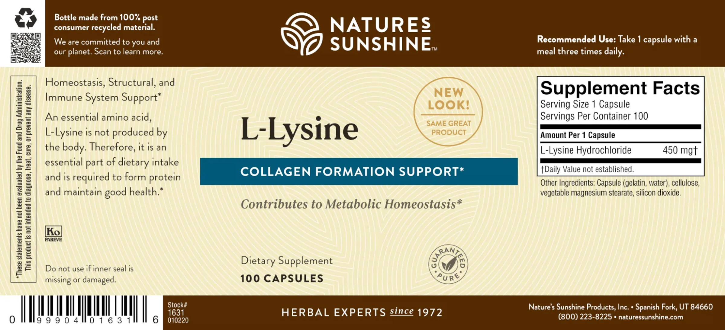 L-lysine is an essential amino acid (cannot be produced by the body) required by the body for the manufacture of proteins. It helps ensure adequate absorption of calcium and the formation of collagen for bone, cartilage and connective tissue. L-lysine strengthens circulation and helps the immune system manufacture antibodies.