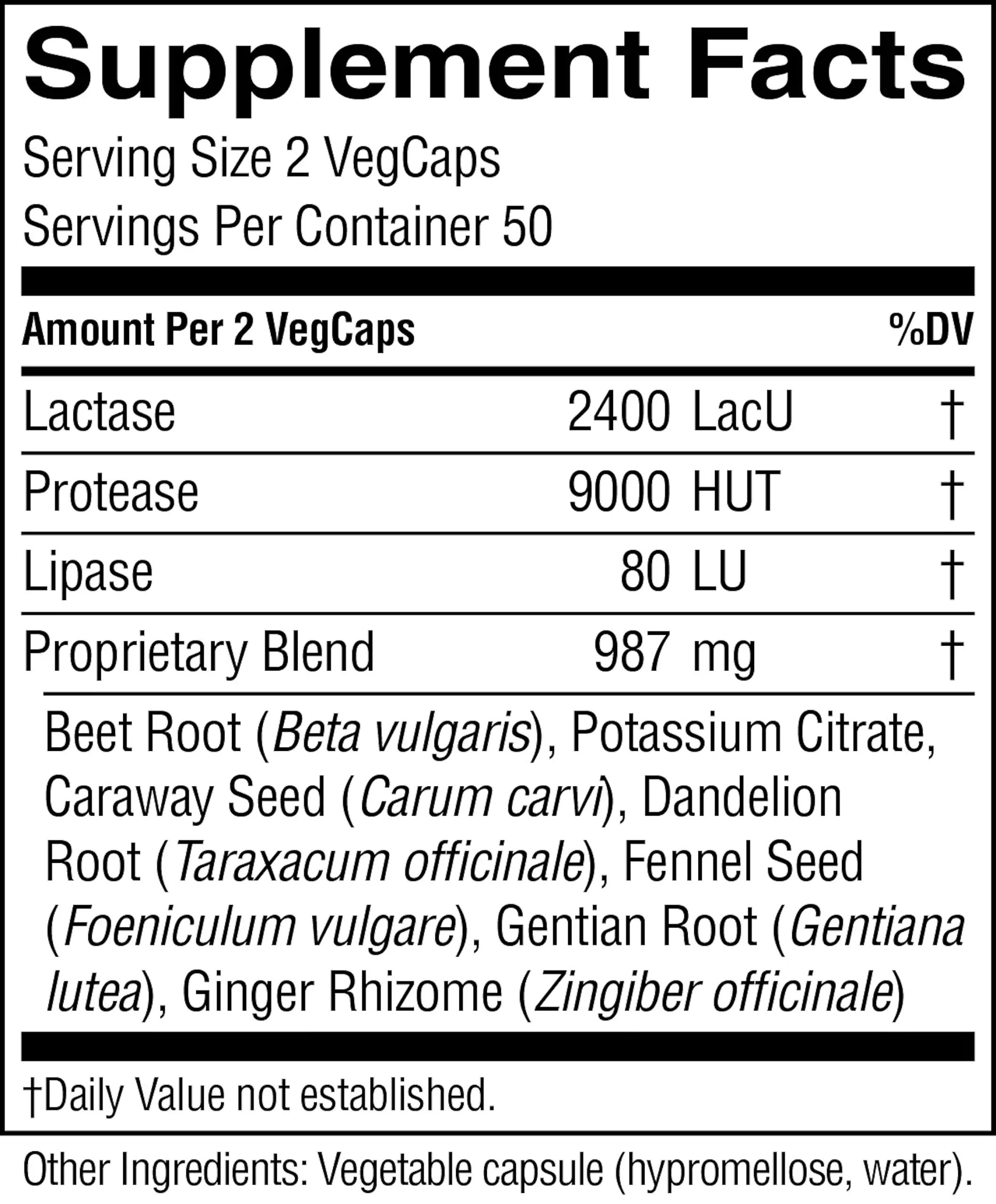 Lactase, protease, lipase, beet root fiber, potassium citrate, caraway seed, dandelion root, fennel seed, gentian root and ginger rhizome.