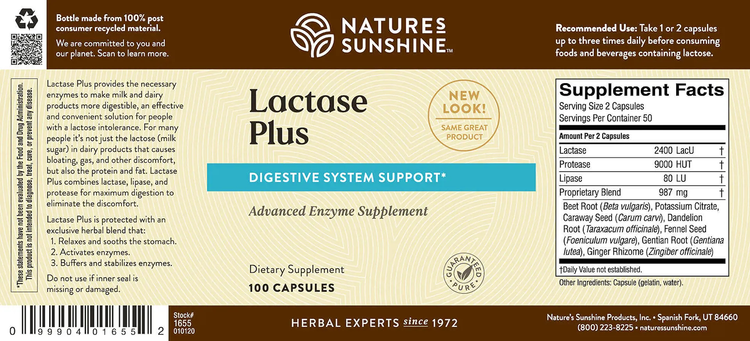 Lactase and protease enzymes help people who have difficulty digesting dairy products by aiding the breakdown of milk sugar and milk protein. This is an effective and convenient solution for people with lactose intolerance. For many people, it’s not just the lactose (milk sugar) in dairy products that causes bloating, gas and other discomfort; it’s also the protein and fat. Lactase Plus combines lactase, lipase and protease for maximum digestion to minimize discomfort. This product contains an exclusive herbal blend that relaxes and soothes the stomach, and supports digestion.