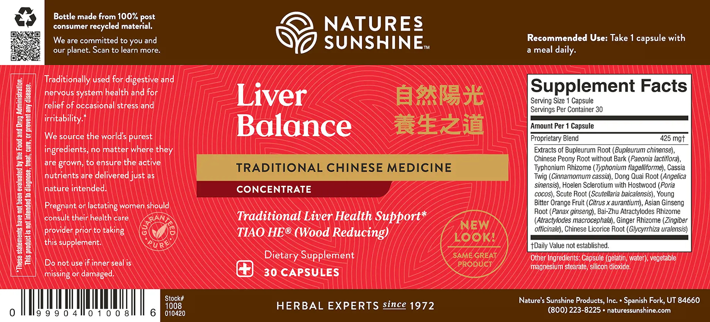 According to the timeless wisdom of Traditional Chinese Medicine, your liver is linked to mood, stress and energy. This harmonizing, concentrated blend of Chinese herbs optimizes liver health and supports the digestive and nervous systems. Key herbs include bupleurum a cooling herb, scute, peony and atractylodes. Traditional use cites support for the nervous system during mental stress and support of the upper digestive system during tension and distress.
