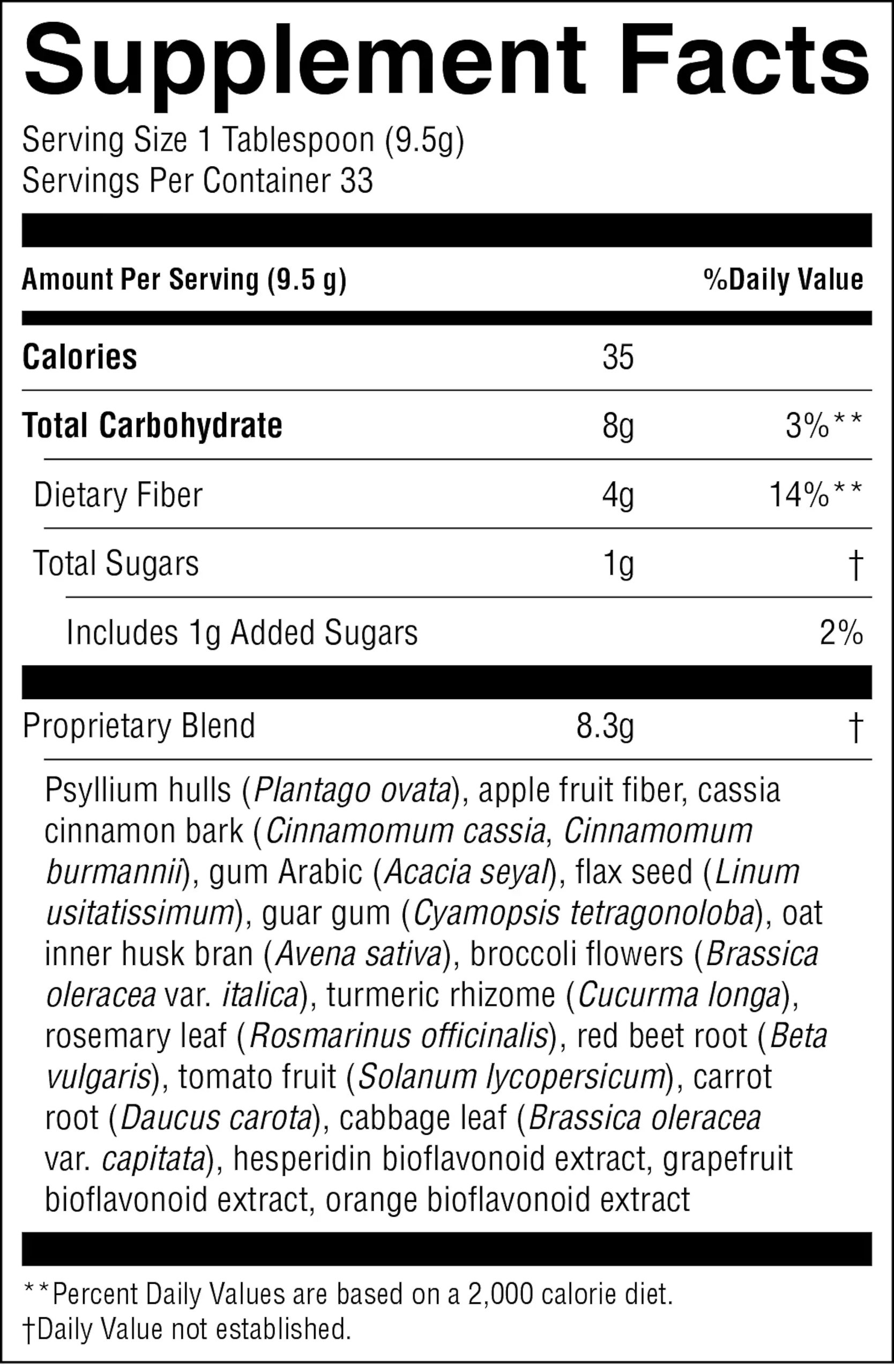 Psyllium hulls, apple fruit fiber, cassia cinnamon bark, acacia gum, flax seed, fructose, guar gum, oat bran, citric acid, malic acid, stevia leaf extract, broccoli flowers, turmeric root, rosemary leaf, red beet root, tomato fruit, carrot root, cabbage leaf, hesperidin, grapefruit bioflavonoid and orange bioflavonoid.
