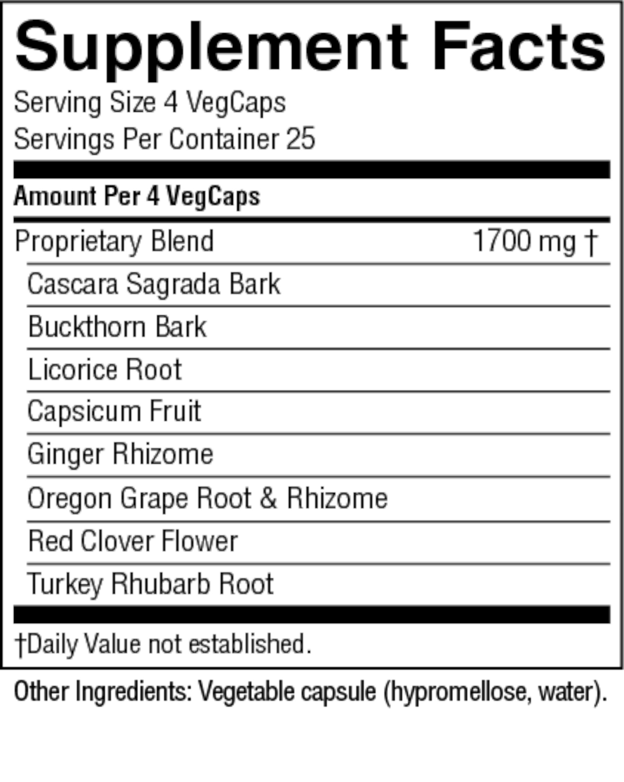 Take 2–4 capsules/tablets daily with a meal. NOTE: This product contains cascara sagrada, buckthorn and Turkey rhubarb. See your health care provider prior to use if pregnant or nursing, any medical condition exists, or when taking any medication. Read and follow recommendation carefully. Not intended for prolonged use. Do not use if diarrhea, loose stools or abdominal pain are present or develop. Use of this product may worsen these conditions and be harmful to your health. Chronic diarrhea can result in serious illness.