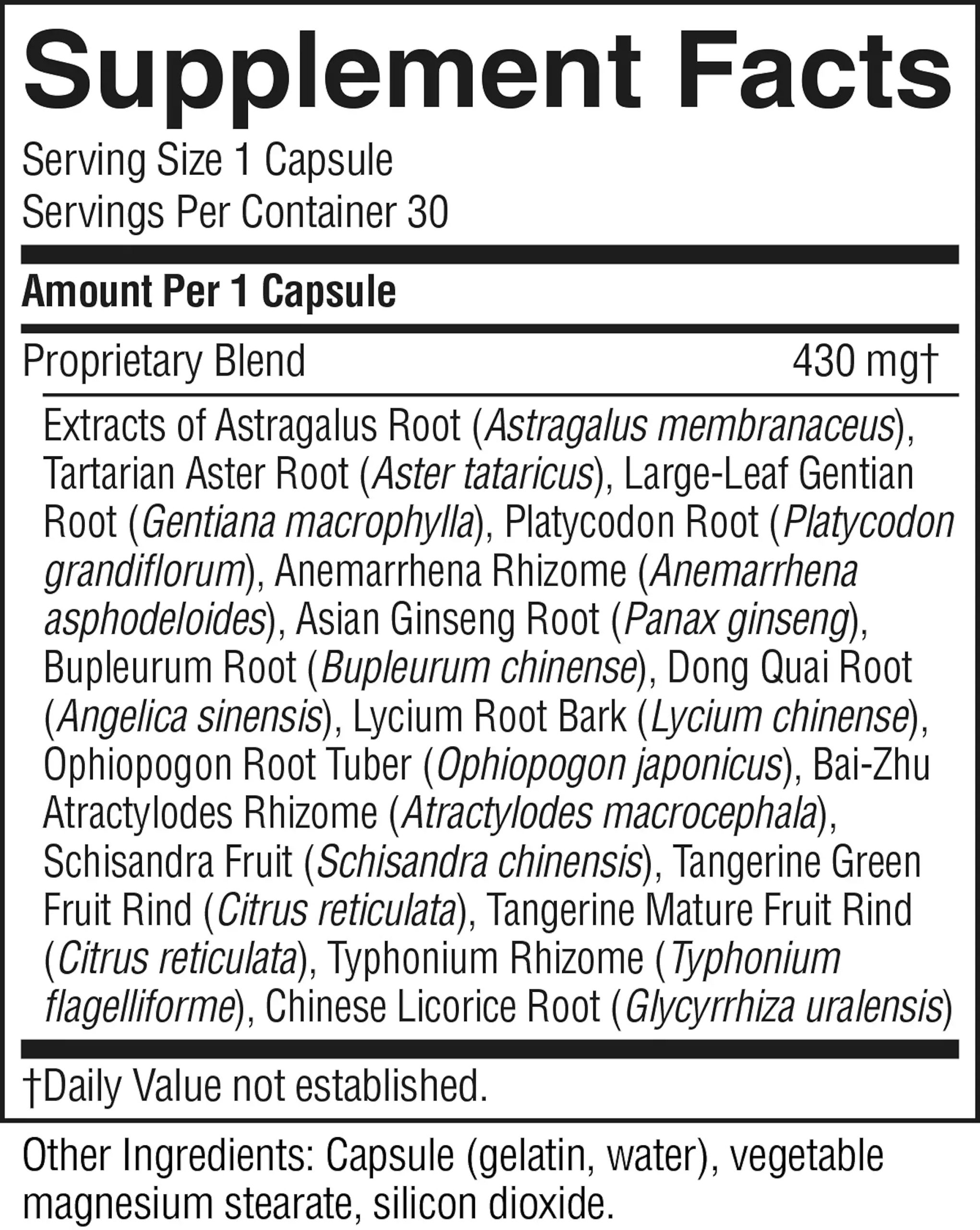 Concentrated extract of astragalus root, tartarian aster root, large-leaf gentian root, platycodon root, anemarrhena rhizome, asian ginseng root, bupleurum root, dong quai root, lycium root bark, ophiopogon root tuber, bai-zhu astractylodes rhizome, schisandra fruit, tangerine green fruit rind, tangerine mature fruit rind, typhonium rhizome and chinese licorice root