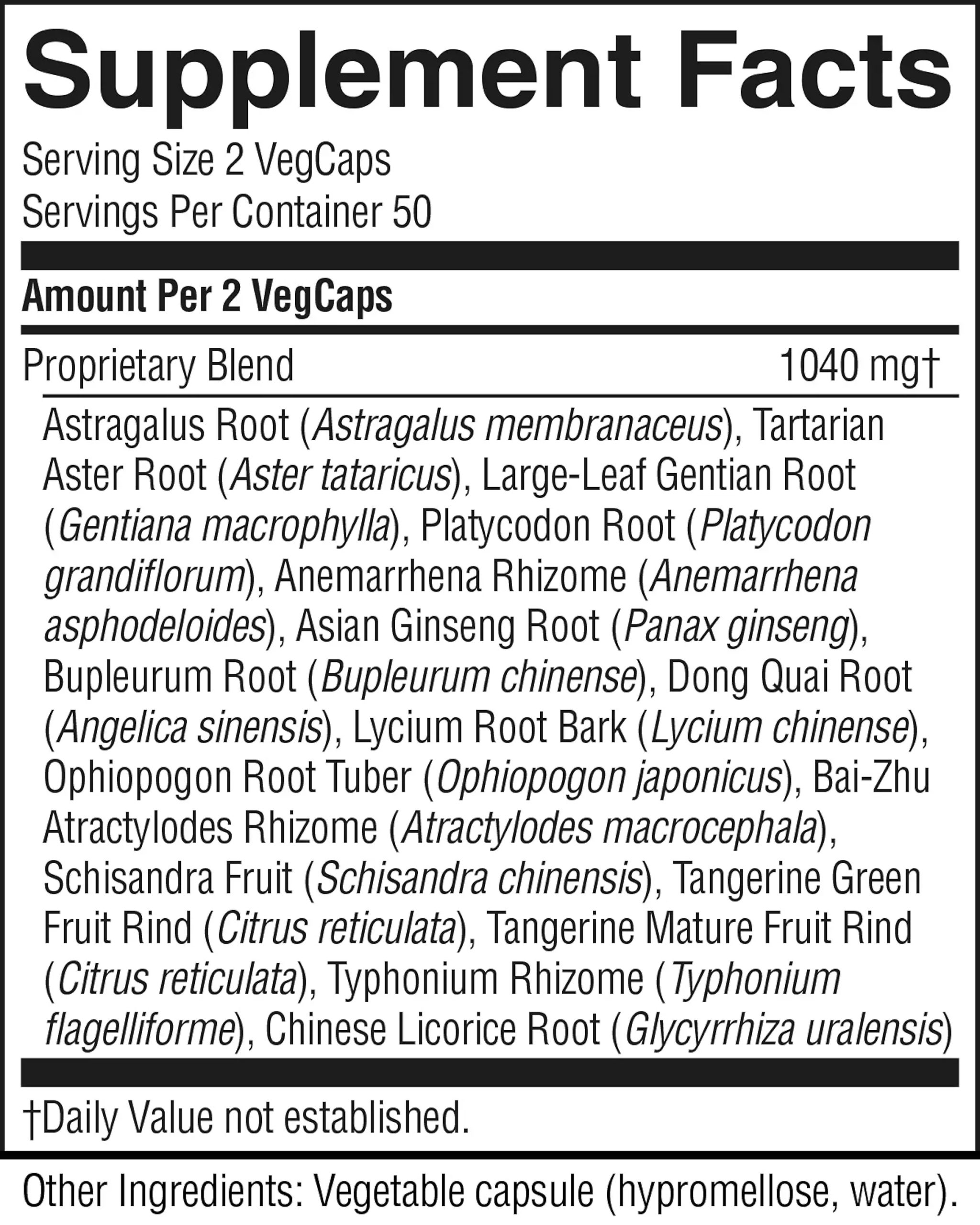 Astragalus root, aster root, qingjiao root, platycodon root, anemarrhena rhizome, bupleurum root, lycium fruit, ophiopogon root tuber, ginseng root, tang-kuei root, atractylodes rhizome, blue citrus peel, citrus peel, schizandra fruit, typhonium rhizome and licorice root.