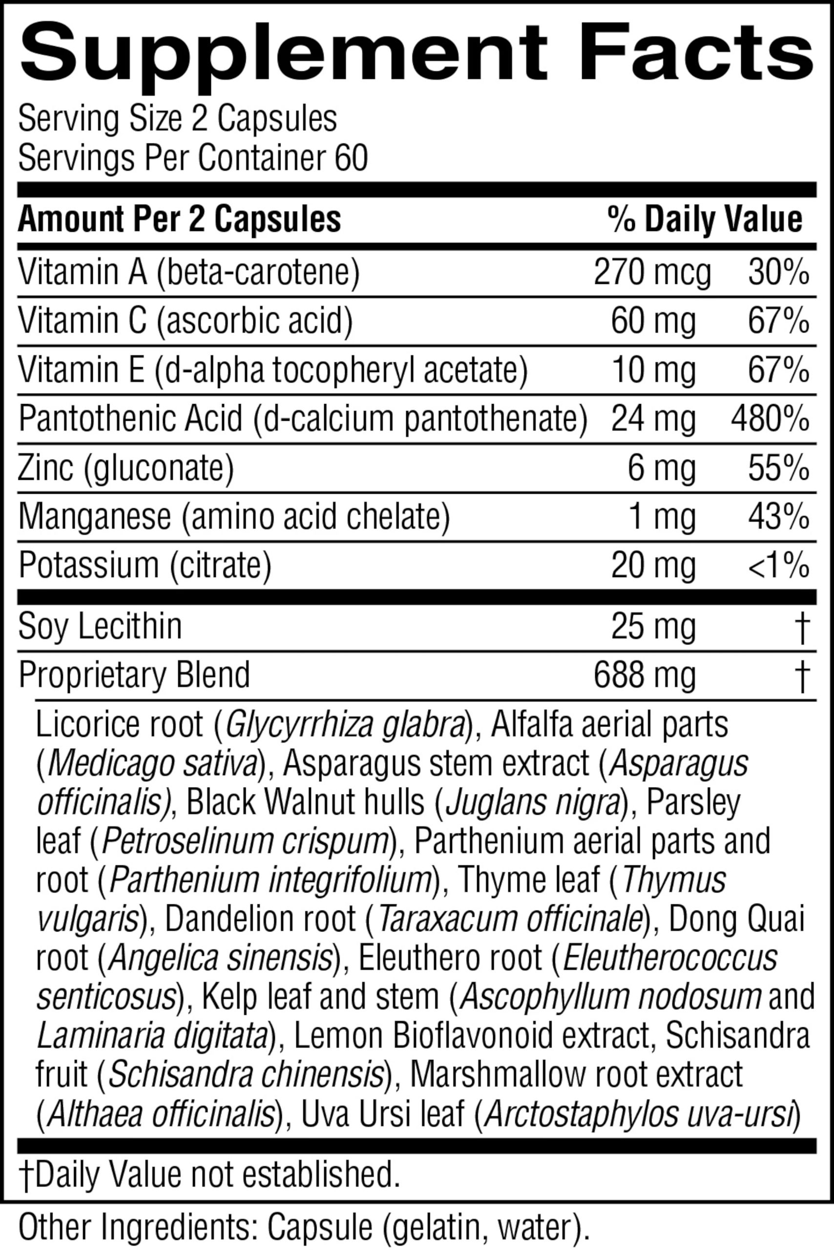 Provides vitamin A, C, E, pantothenic acid, zinc and manganese per serving, plus potassium, licorice root, alfalfa aerial parts, asparagus stem extract, black walnut hulls, parsley leaves, parthenium root, thyme leaves, dandelion root, dong quai root, eleuthero root, kelp leaves and stem, lemon bioflavonoids, schizandra fruit, marshmallow root extract, uva ursi leaf and soy lecithin