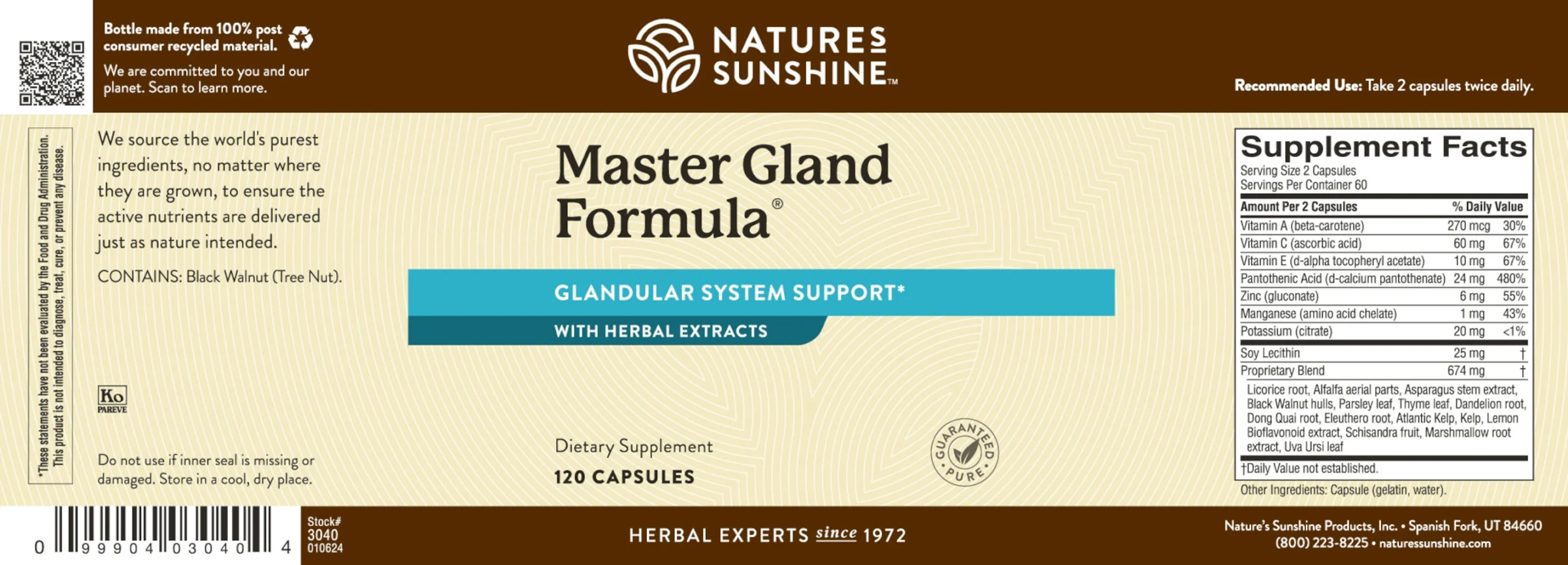 Master Gland® supports the glandular system and body by providing dietary antioxidants such as vitamins A, C and E. Essential minerals and electrolytes complement these powerful antioxidants. For example, manganese and zinc are components of many enzymes that play roles in macronutrient metabolism. And pantothenic acid supports fatty acid metabolism. In this way, the formula promotes energy production and metabolism. Master Gland® also contains bioflavonoids for additional antioxidant support, and a terrific herbal base adds extra nutritional support. Alfalfa aerial parts have been used traditionally as a tonic. Dandelion root is widely used to support the liver and gallbladder. Some also use it for the maintenance of the pancreas. Dong quai has traditional uses that support women’s life cycles. Kelp provides trace minerals essential for the thyroid gland.Licorice and thyme support the respiratory system and the GI tract. Thyme has been traditionally used for menstrual cramps.