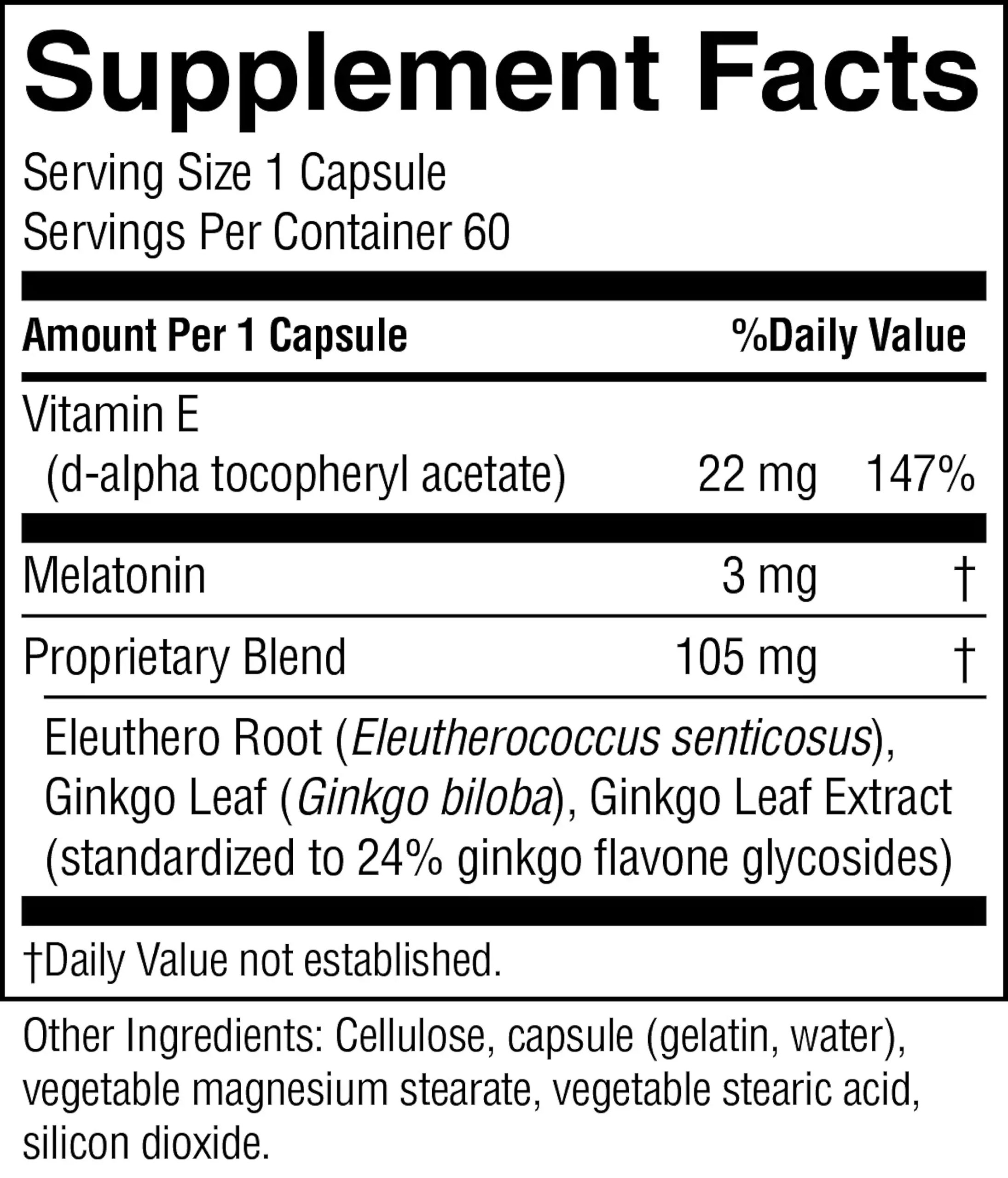 3 mg melatonin, vitamin E, ginkgo leaf and leaf extract, and eleuthero root