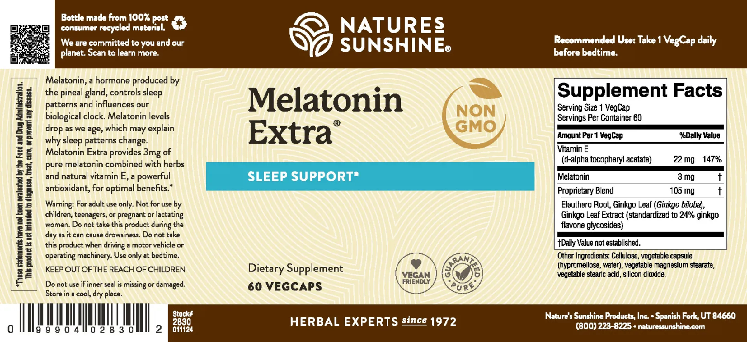 With age, a good nights sleep can become elusive. that’s why Melatonin Extra provides 3 mg pure melatonin along with herbs and nutrients for nervous system support. Like powerful ginkgo leaf extract from China that is non-GMO, vegan, Kosher and Halal-certified. Melatonin Extra opens the door to the sleep you need