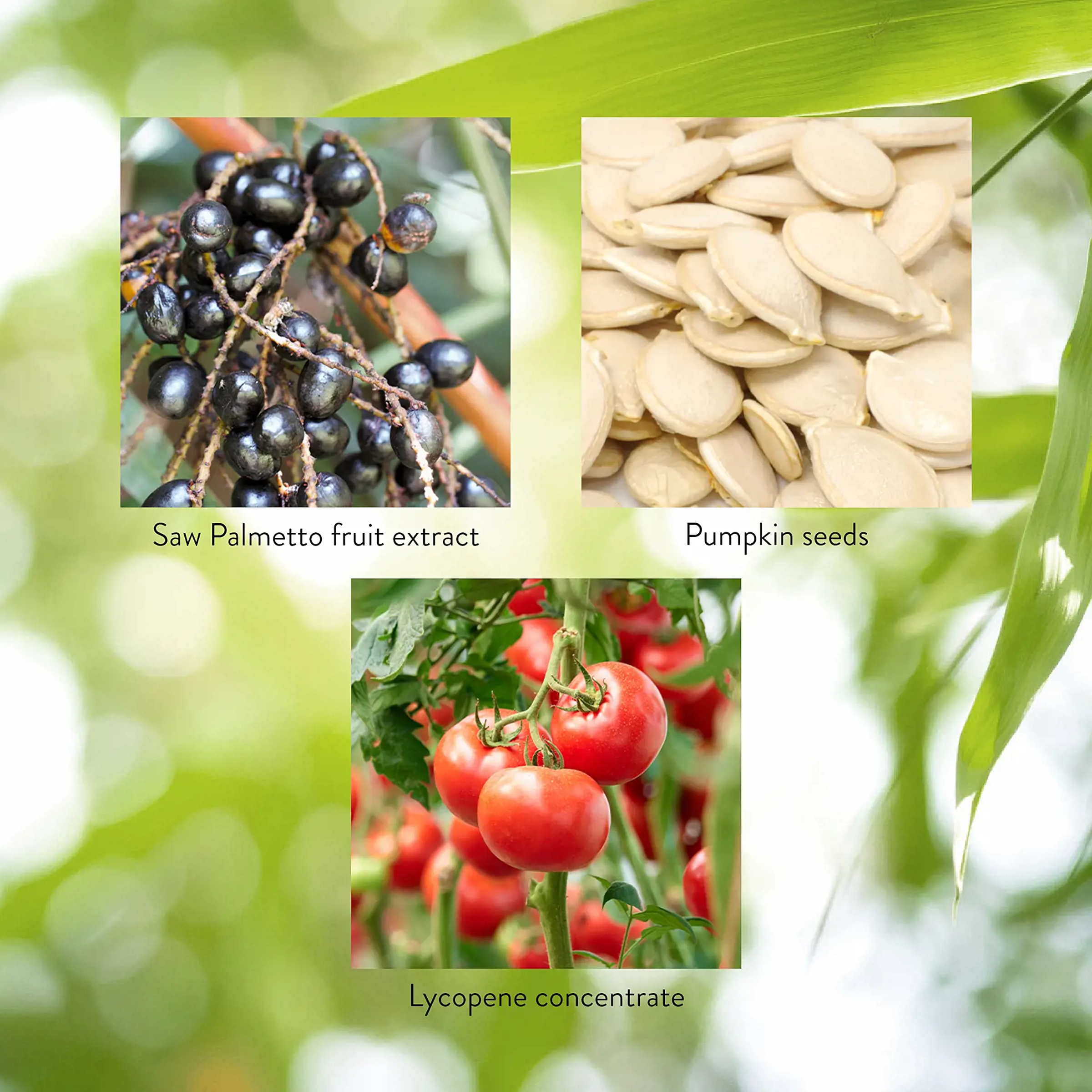 15 mg zinc, saw palmetto fruit extract, pumpkin seeds, pygeum bark extract, gotu kola aerial parts, lycopene concentrate and stinging nettle root extract
