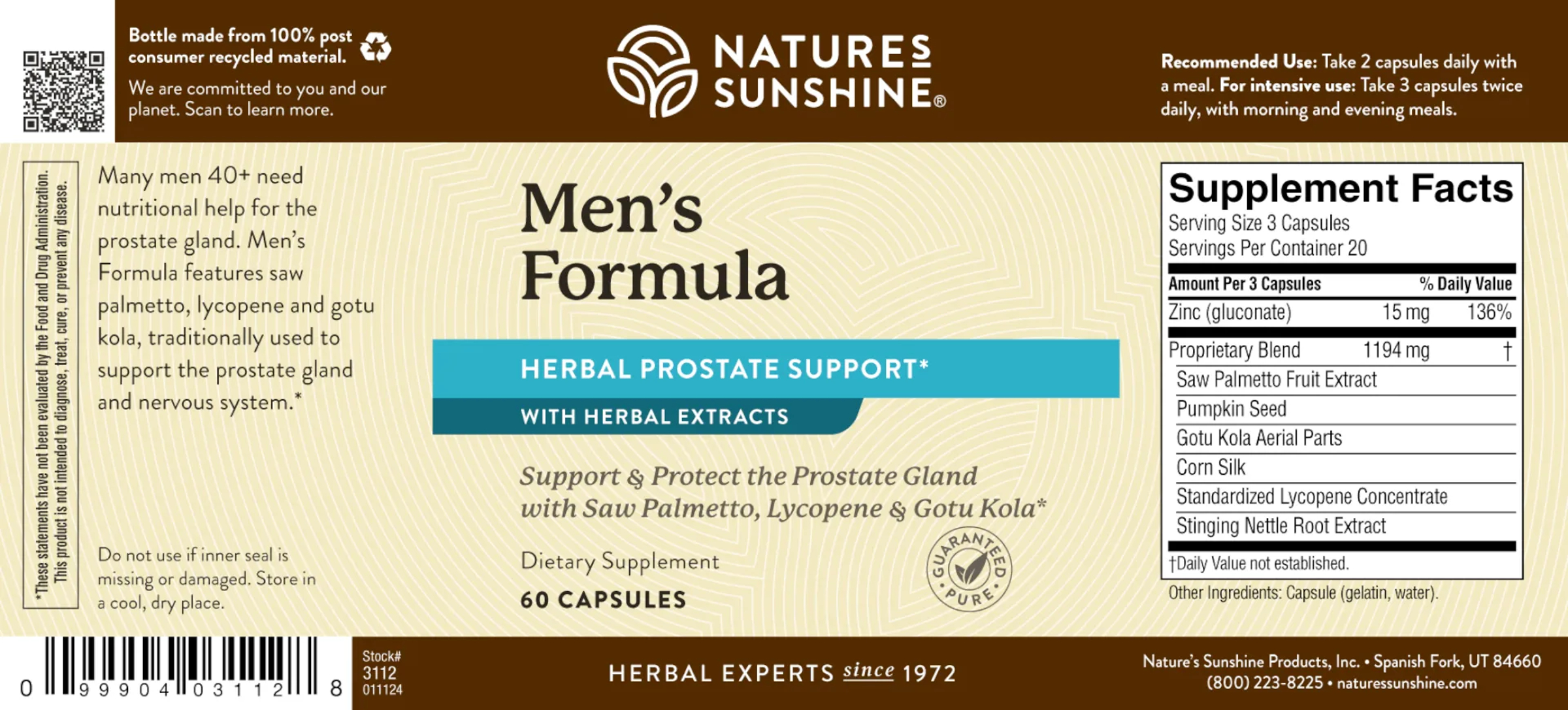 Shout-out to the prostate gland. Most guys don’t pay much attention to prostate health. But they should. This blend offers nutrition that’s especially needed by the male body, including saw palmetto, lycopene, pumpkin seeds, zinc and more. Eat healthy, exercise,get PSA levels checked,and add Men’s Formula to your nutritional regimen.