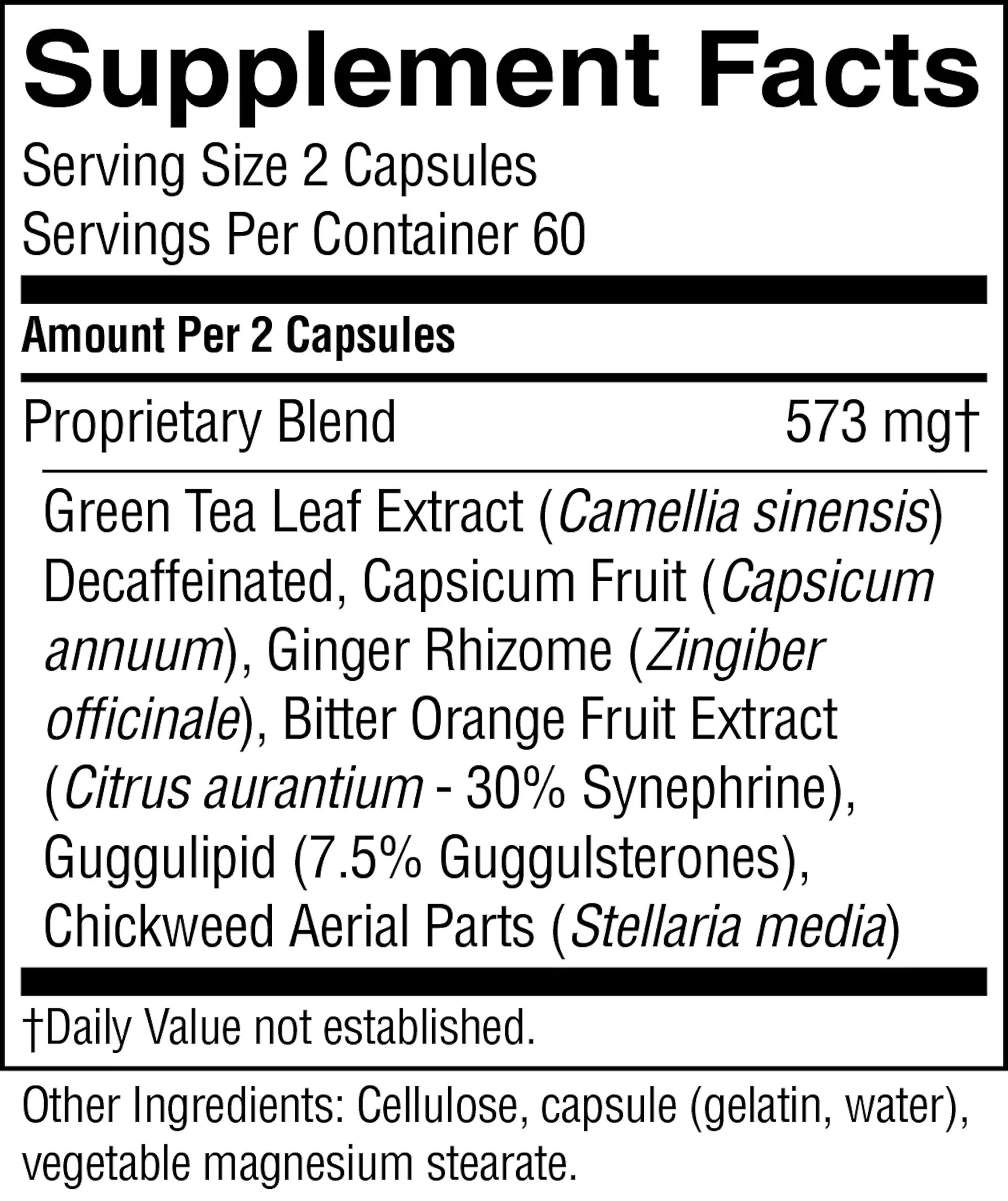 Decaffeinated green tea leaf extract, capsicum fruit, ginger rhizome, bitter orange fruit extract, guggulipid and chickweed aerial parts