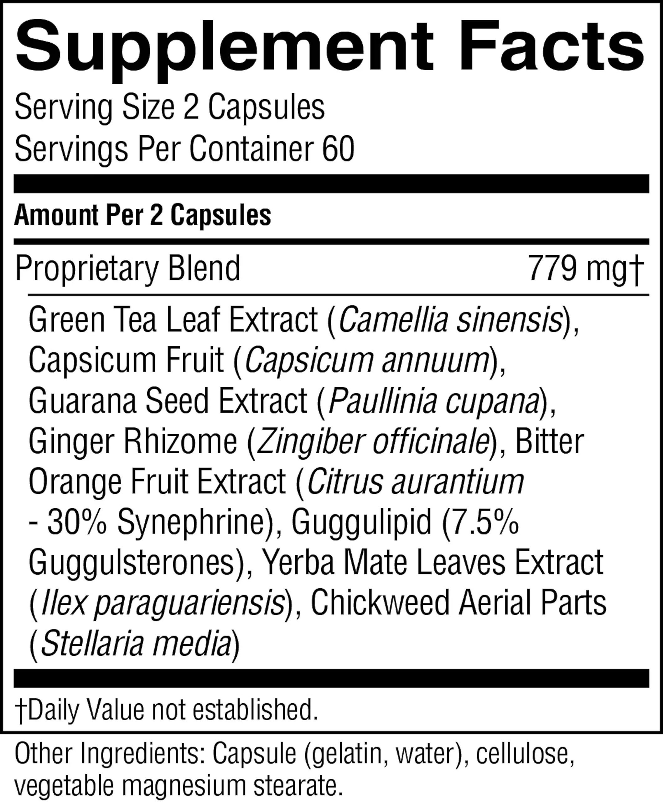 Green tea leaf extract, capsicum fruit, guarana seed extract, ginger rhizome, bitter orange fruit extract, guggulipid, yerba mate leaves extract and chickweed aerial parts