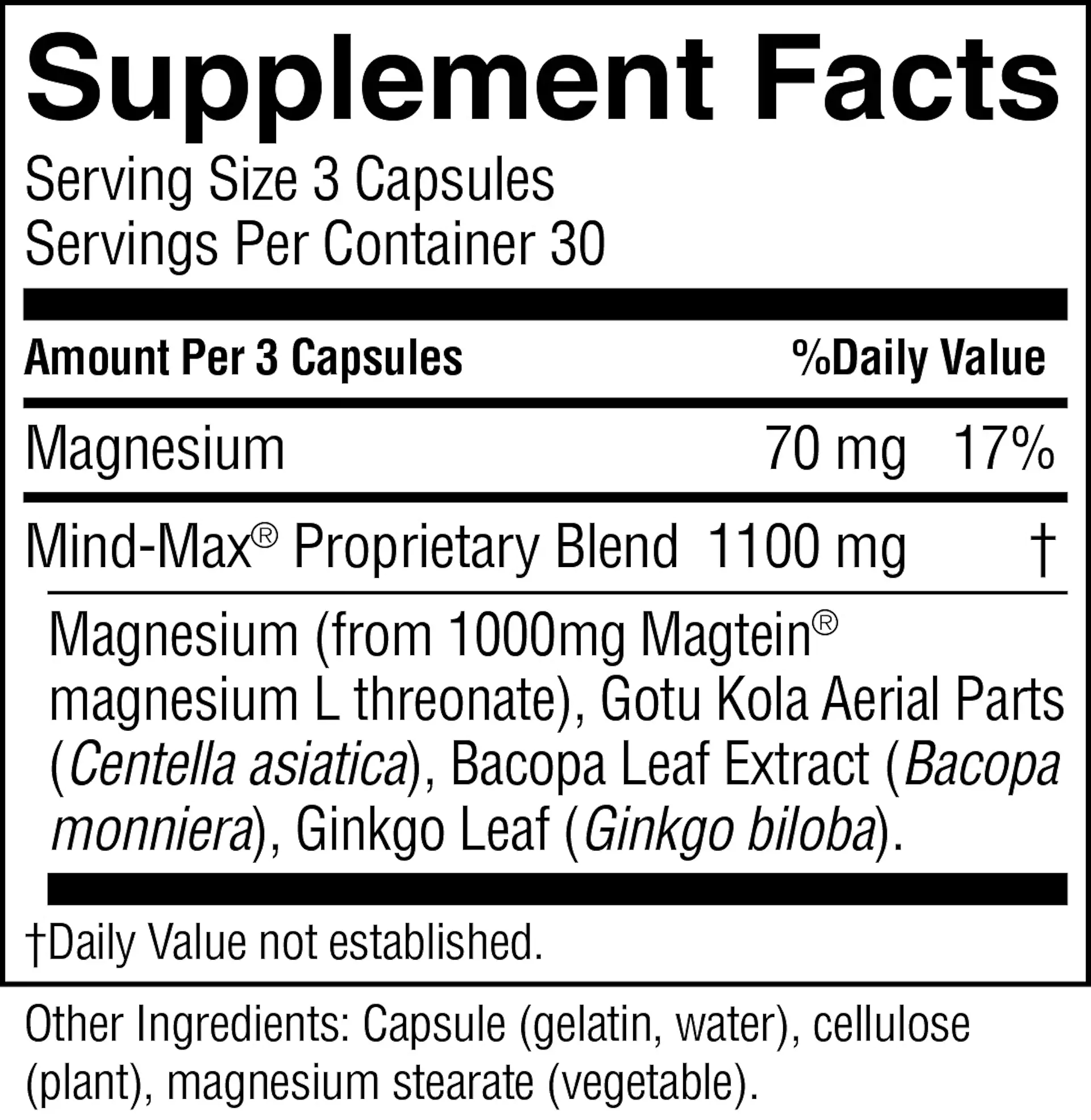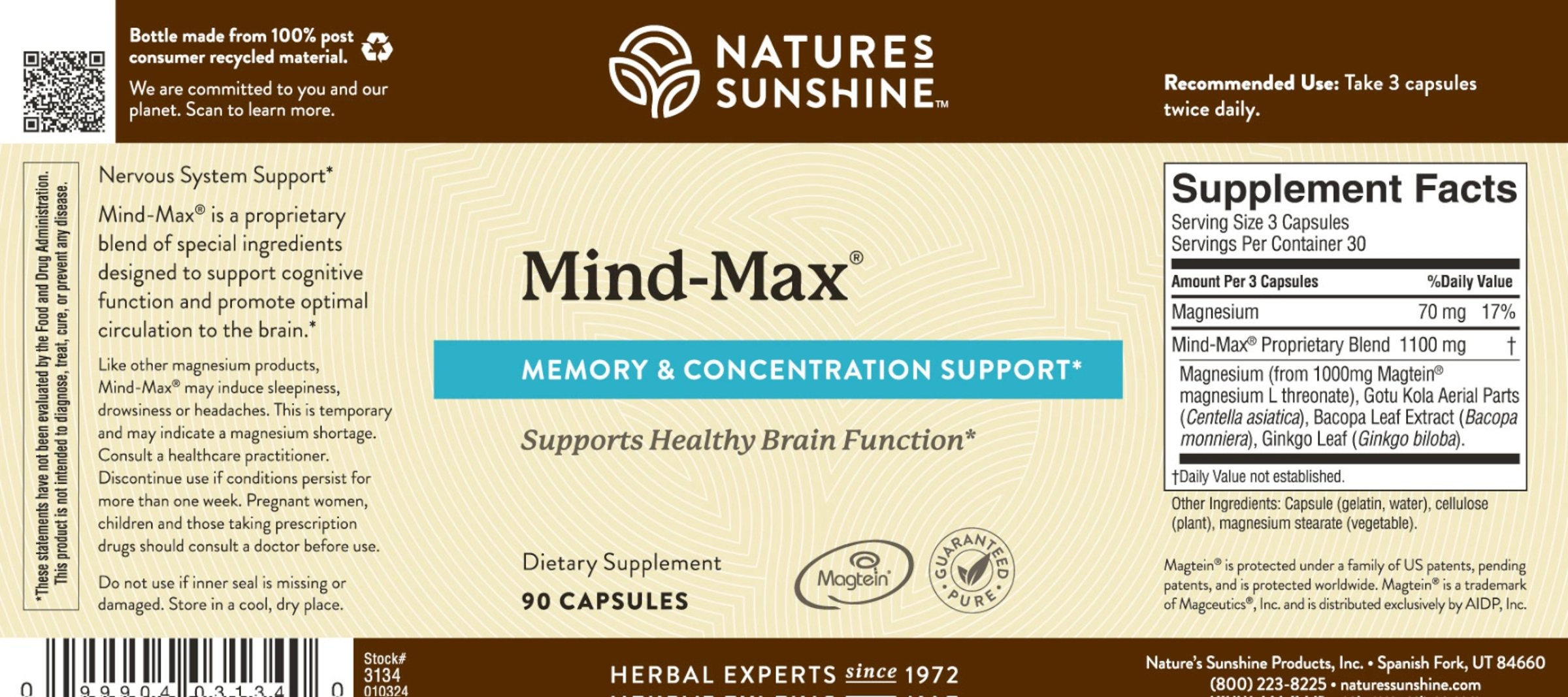 Remember where you parked the car Hey, we all forget things from time to time. But Mind-Max can help. It supports proper brain function, helps with concentration and aids memory. Featuring magnesiuml-threonate plus time-honored botanicals gotukola, bacopa and ginkgo. To do our part for the earth, we partner with a vendor for non-GMO bacopa grown with harvested rainwater and solar-powered pumps.