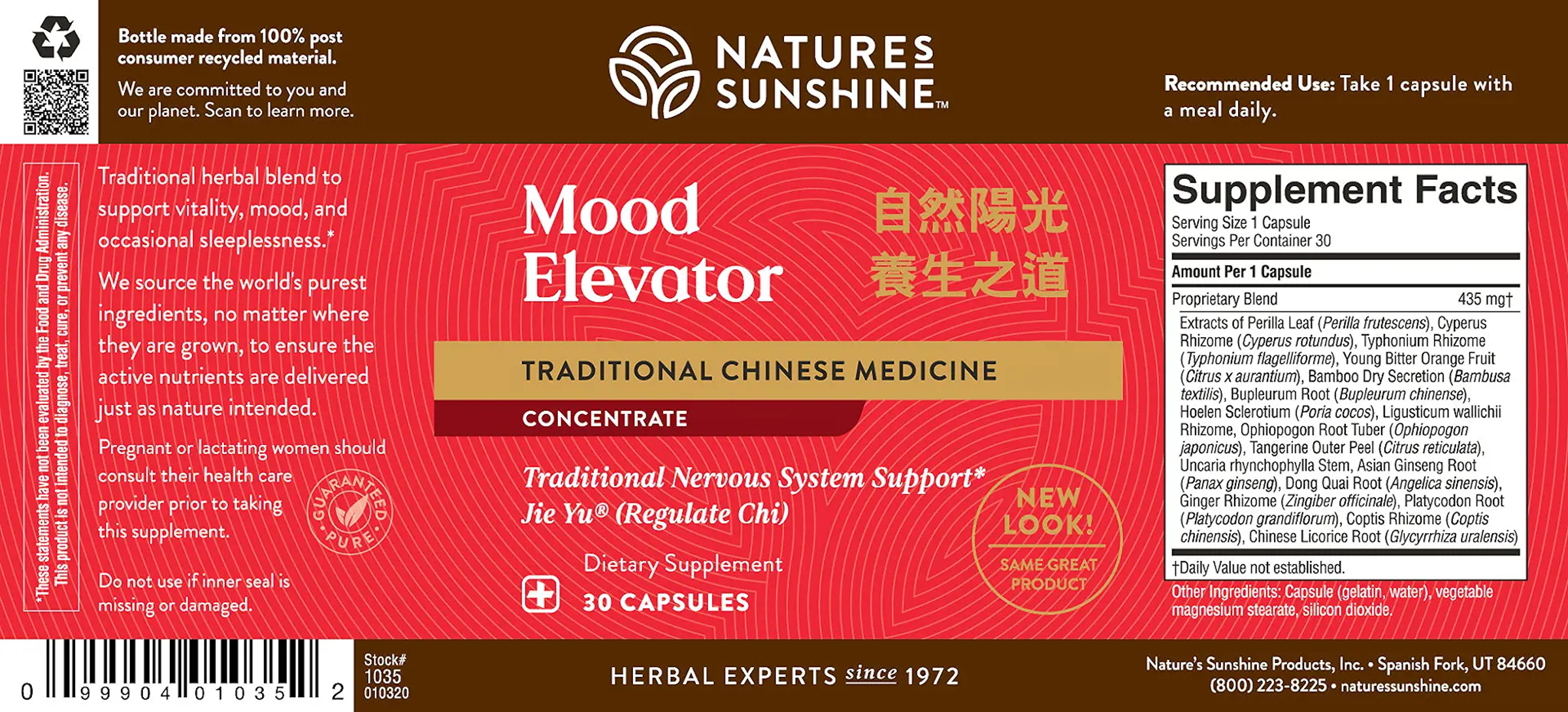 Do you need a mood adjustment Improve your sense of well-being with Mood Elevator TCM, a concentrated blend of Chinese herbs that strengthens liver function and supports mood. Untrap your chi vitality, and strengthen liver function to help maintain a positive mood. This concentrated botanical blend features ethically sourced ingredients grown by trusted farmers.