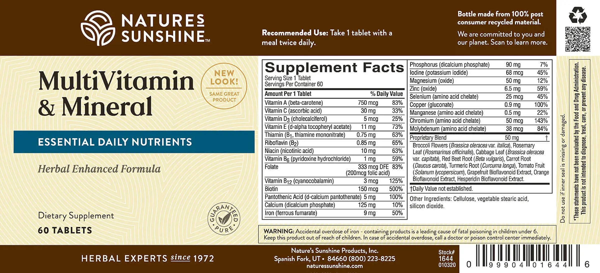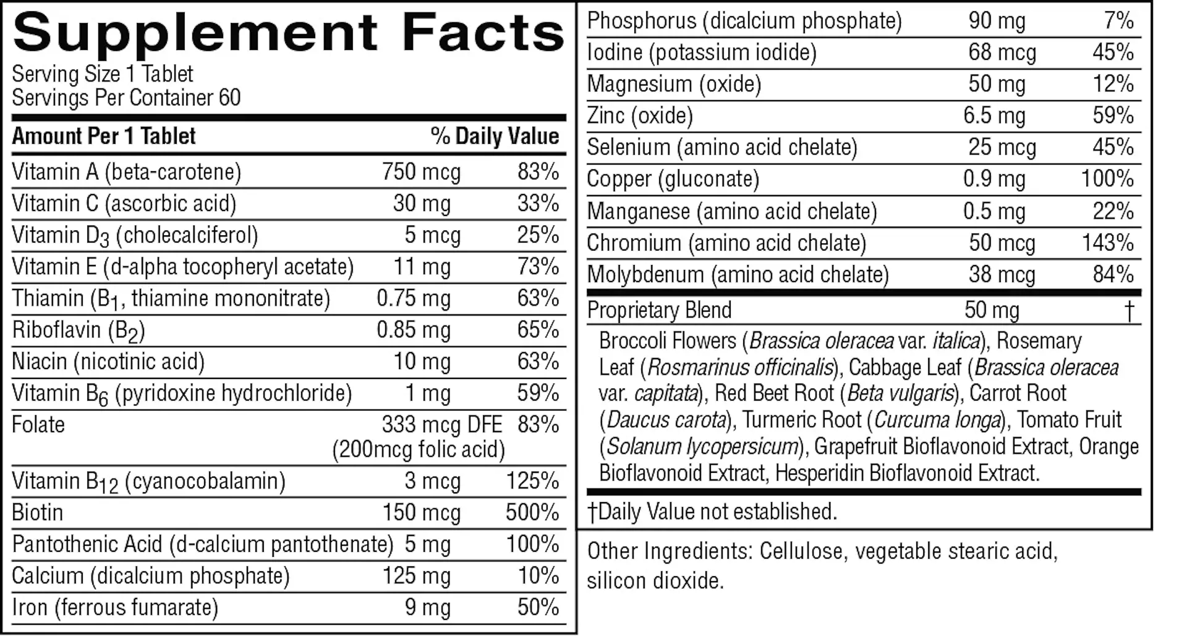 Provides 100% of the Daily Value of vitamin A, C, D, E, thiamin (B1), riboflavin (B2), niacin, B6, folic acid, B12, biotin, pantothenic acid, iron, iodine, zinc, copper and molybdenum. Also contains calcium, phosphorus, magnesium, selenium, manganese and chromium, plus broccoli flowers, turmeric root, red beet root, rosemary leaves, carrot root, tomato fruit, cabbage leaves, orange bioflavonoids, grapefruit bioflavonoids and hesperidin.