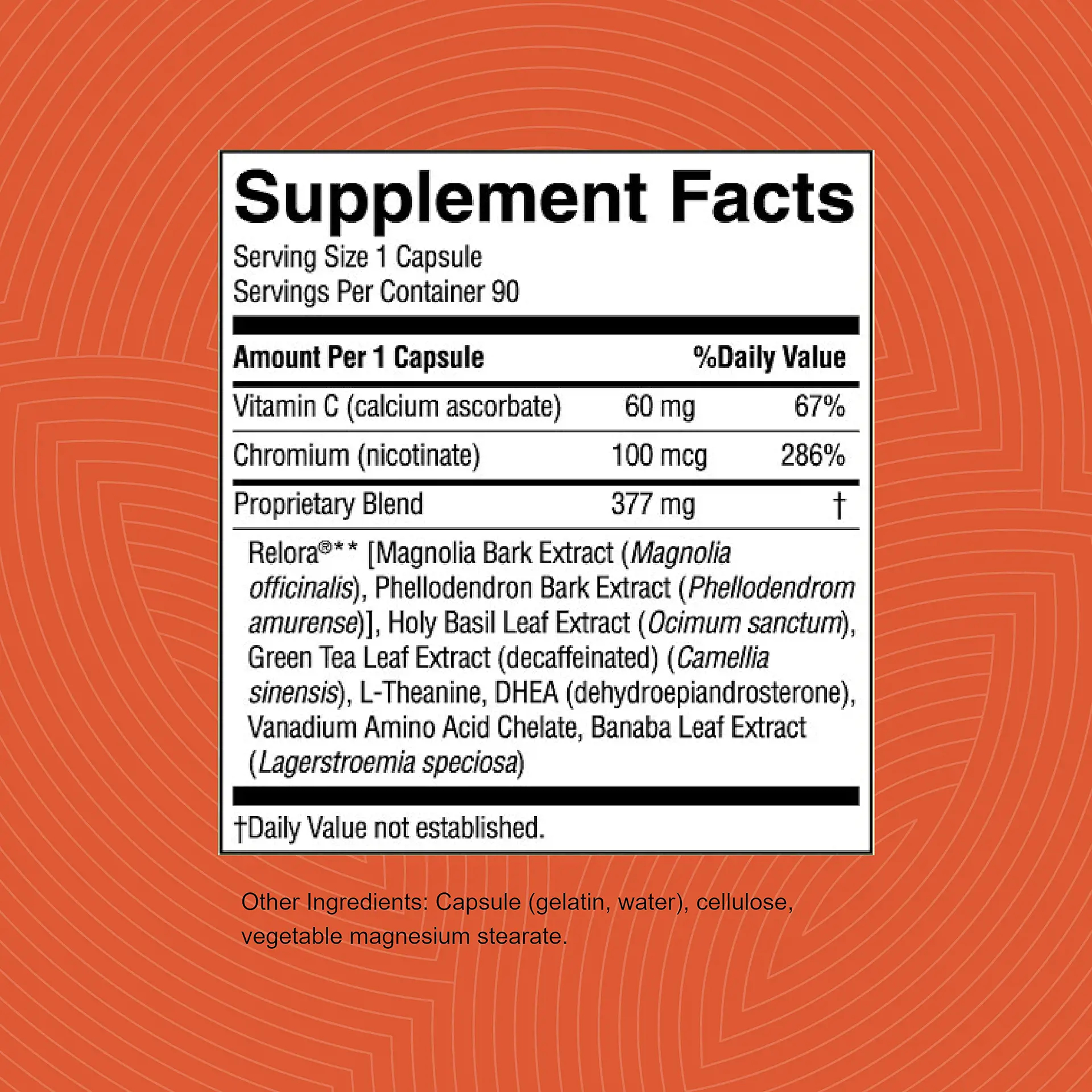 60 mg vitamin C (100% Daily Value) 100 mcg chromium (83% DV), Relora (a proprietary blend of magnolia bark extract and phellodendron bark extract), holy basil leaves extract, green tea leaf extract, banaba leaf extract, l-theanine, DHEA and vanadium