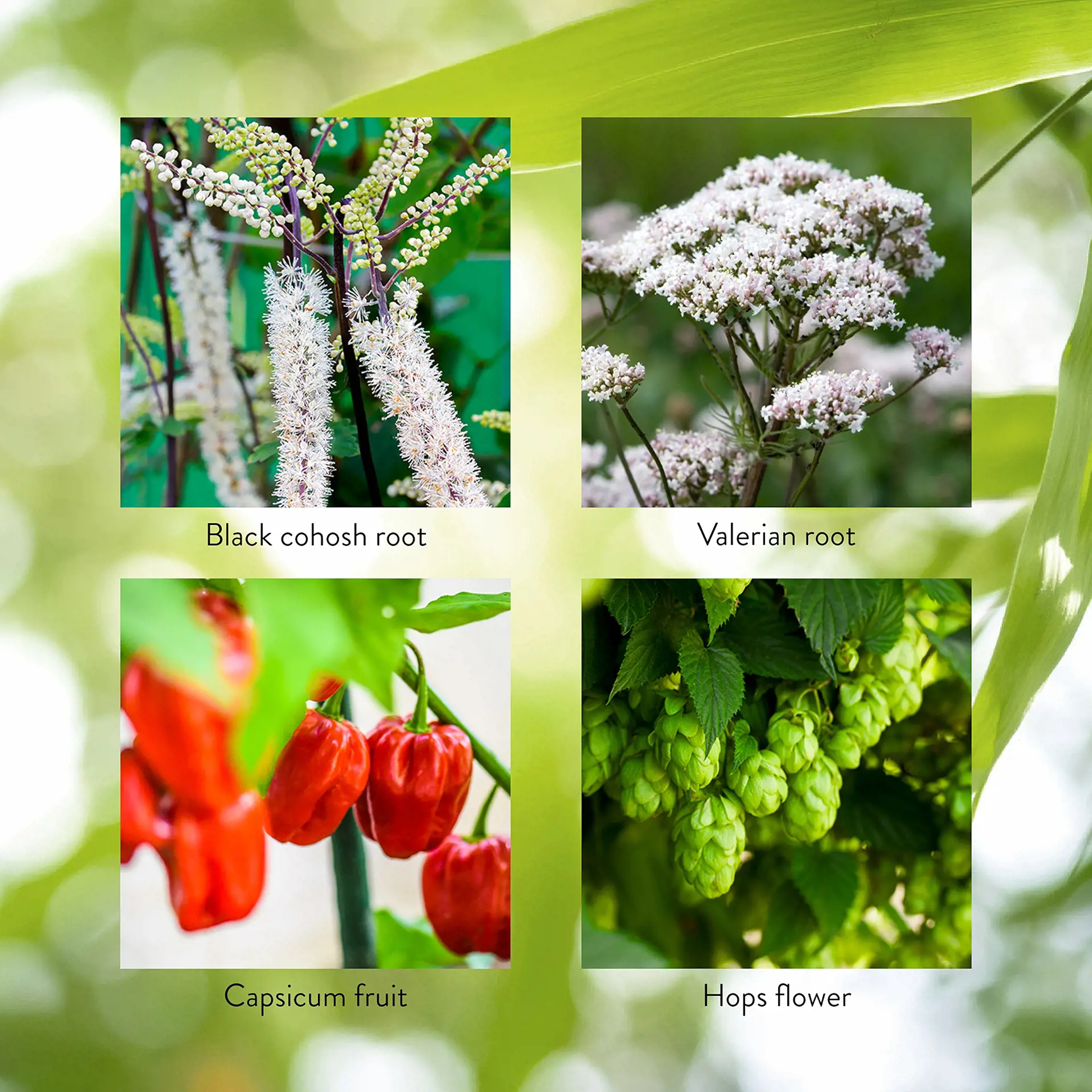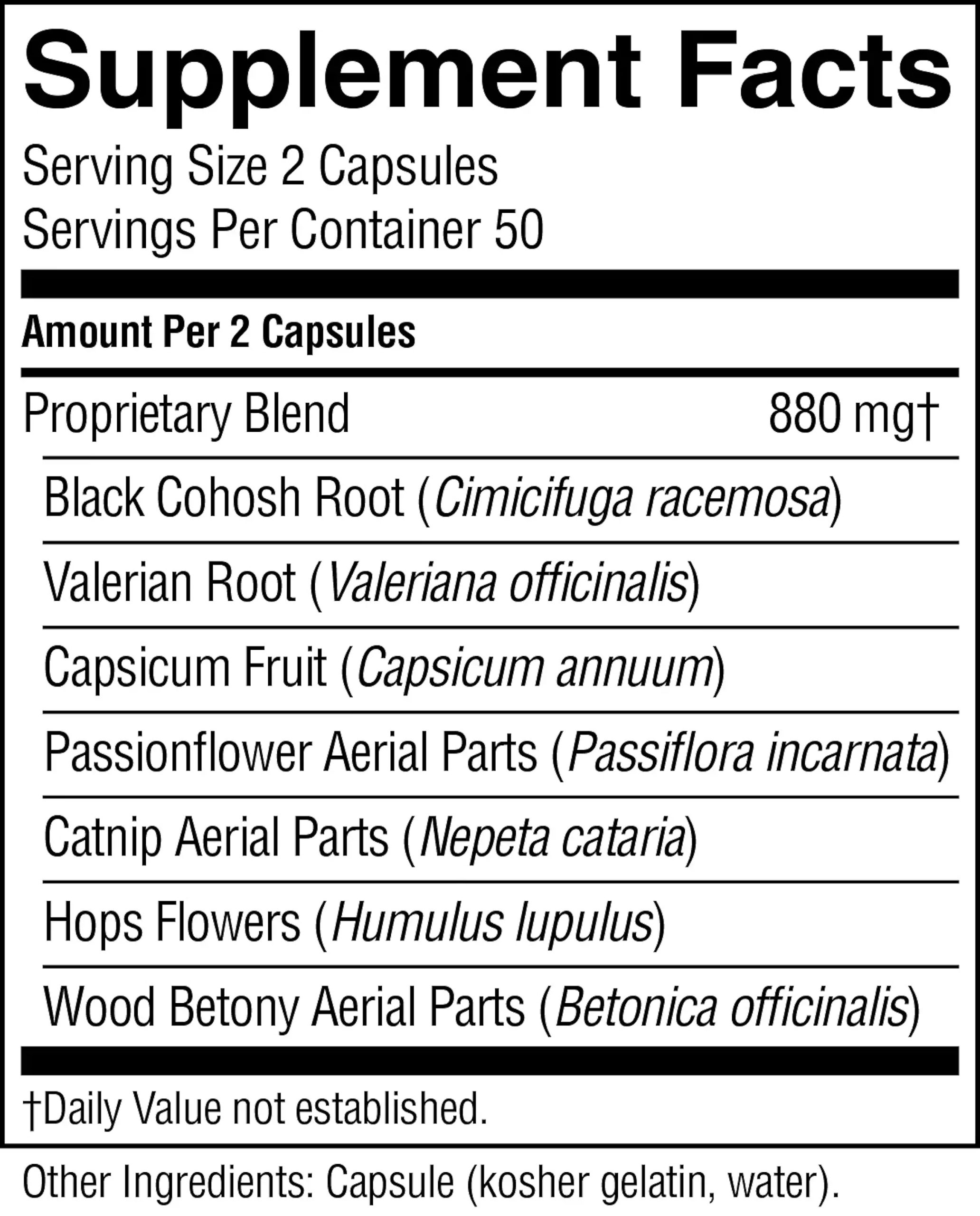 Black cohosh root, valerian root, capsicum fruit, passionflower aerial parts, catnip leaf, hops flower and wood betony aerial parts