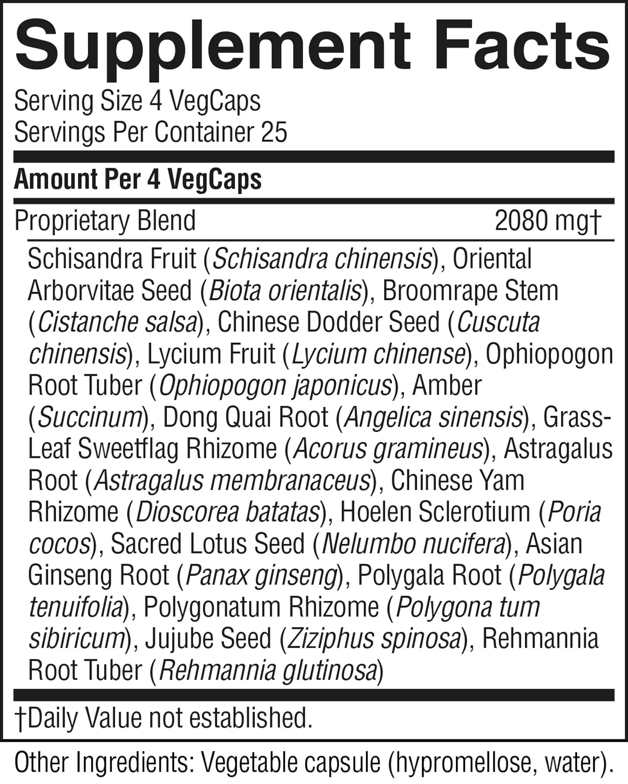 Schisandra fruit, biota seed, cistanche stem, cuscuta seed, lycium fruit, ophiopogon root tuber, succinum amber, tang-kuei root, acorus rhizome, astragalus root, dioscorea rhizome, hoelen sclerotium, lotus seed, ginseng root, polygala root, polygonatum rhizome, jujuba seed and rehmannia root tuber.