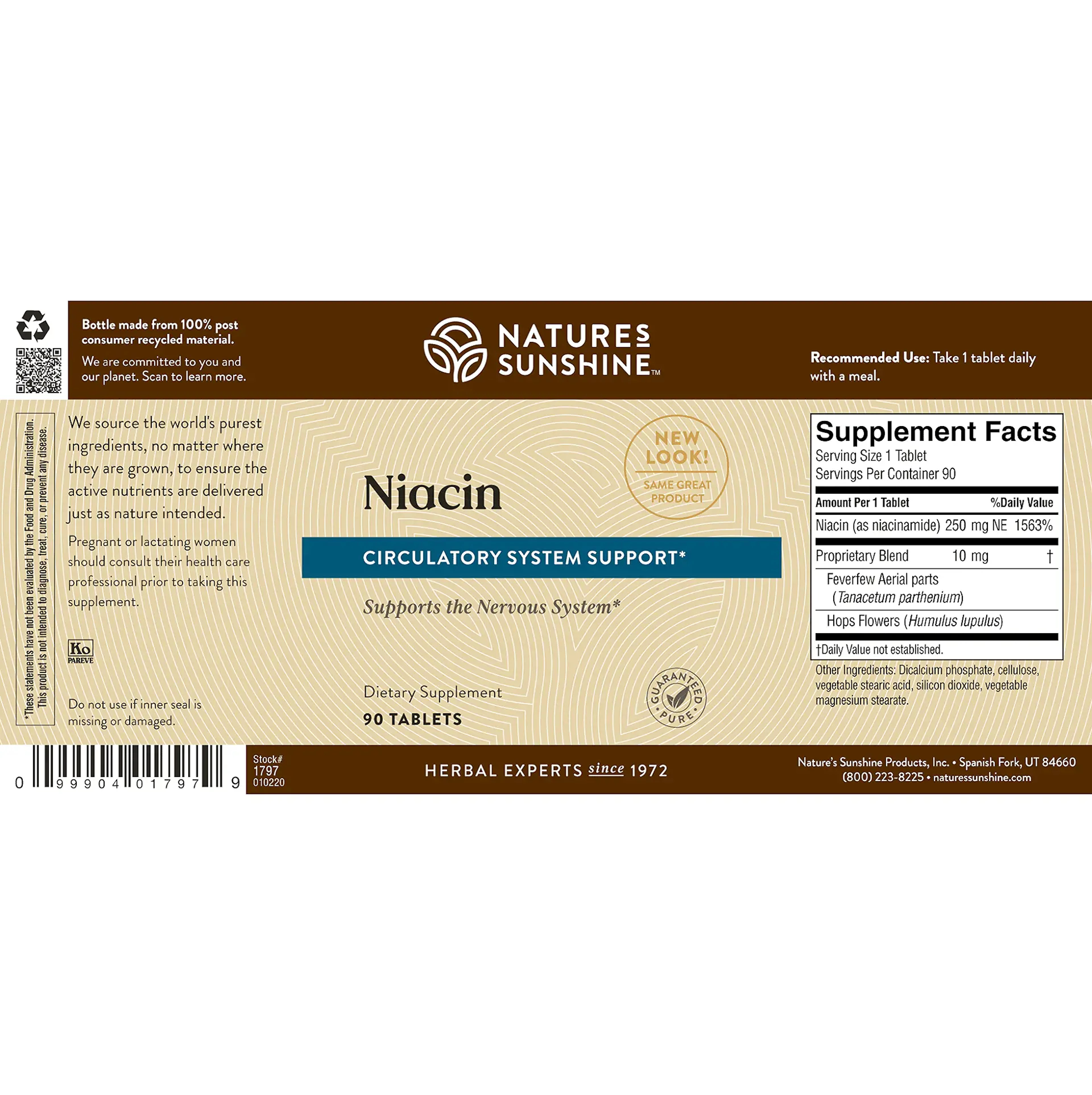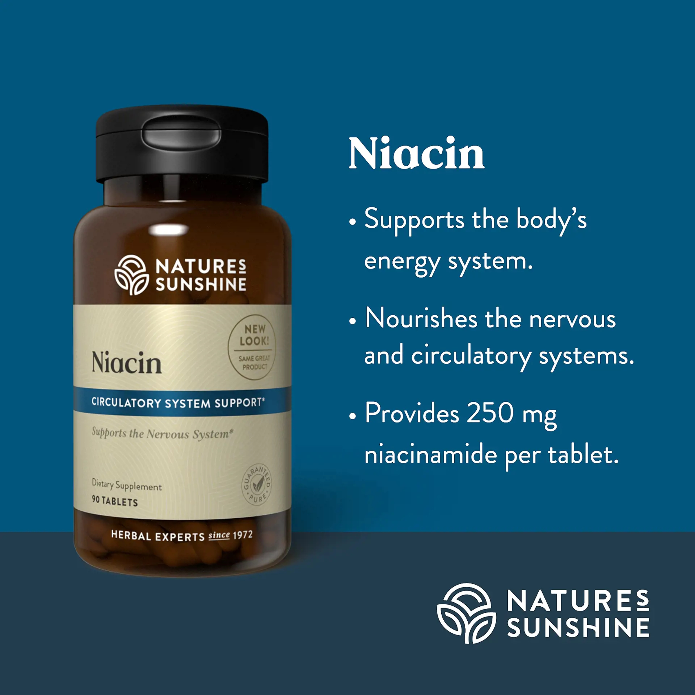 Niacin helps the body utilize carbs, proteins and fats for energy. It also supports skin health and the nerves. This supplement provides niacin (vitamin B3) in the form of niacinamide.