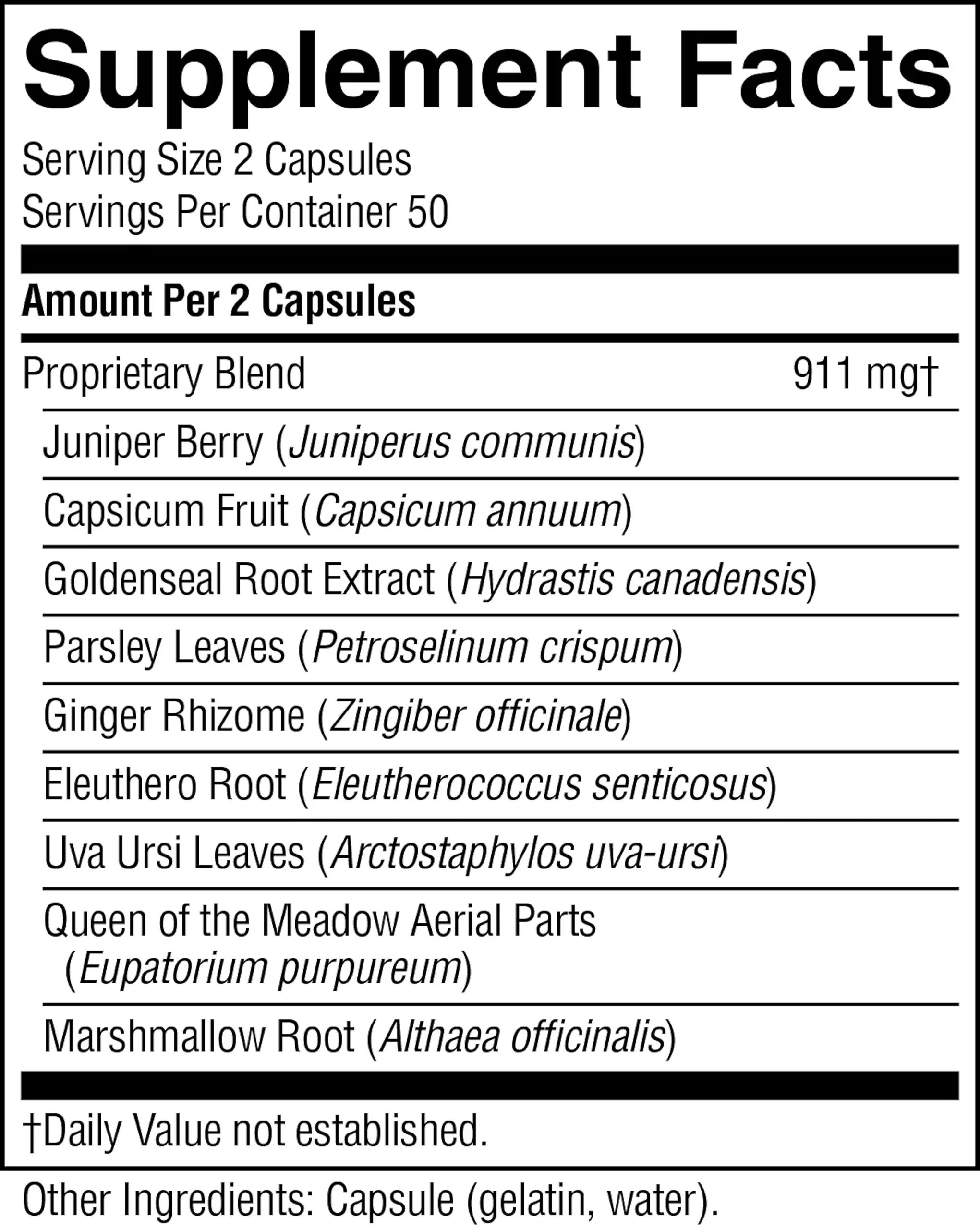 Juniper berries, goldenseal root and rhizome, capsicum fruit, parsley leaves, ginger rhizome, eleuthero root, uva ursi leaves, queen of the meadow leaves and marshmallow root.