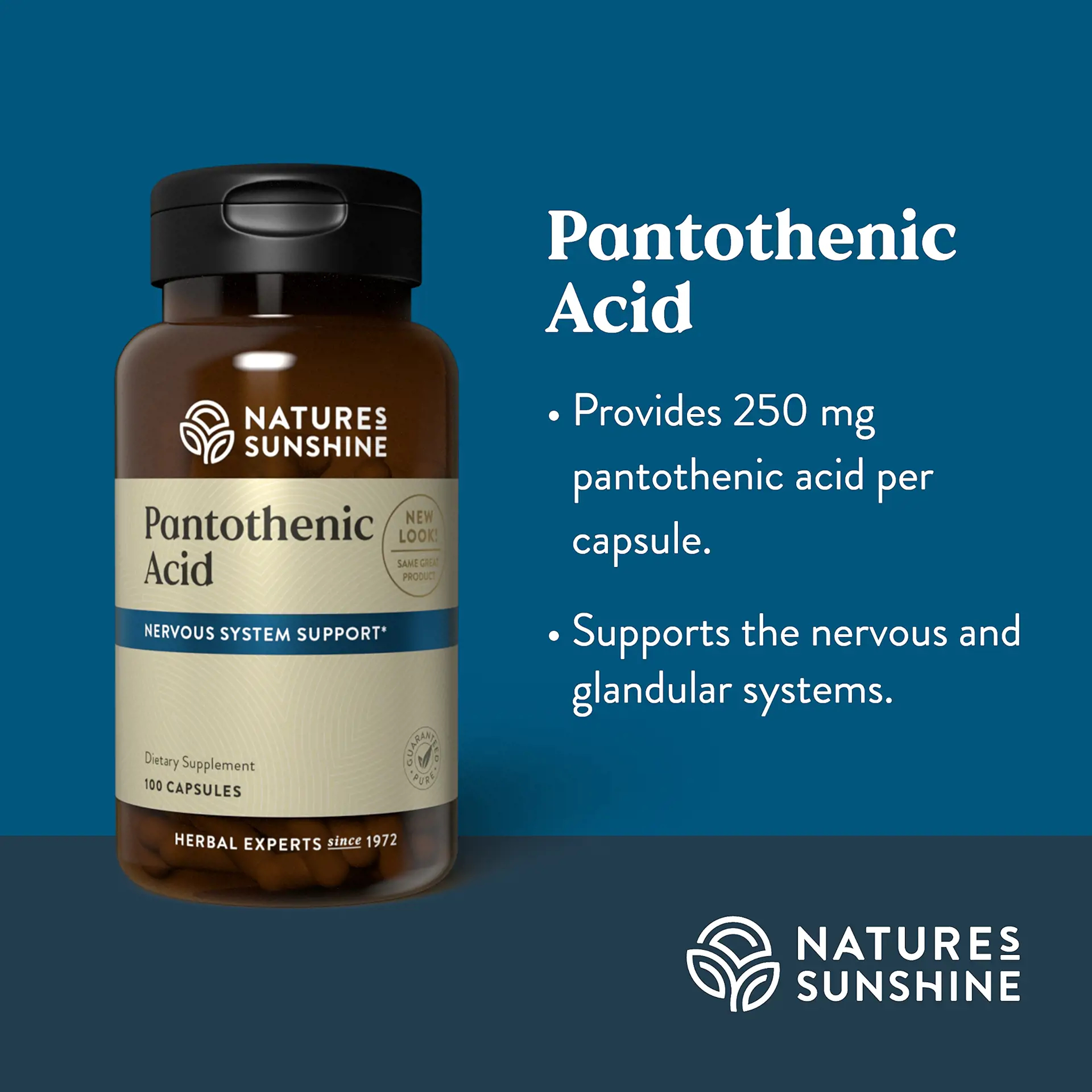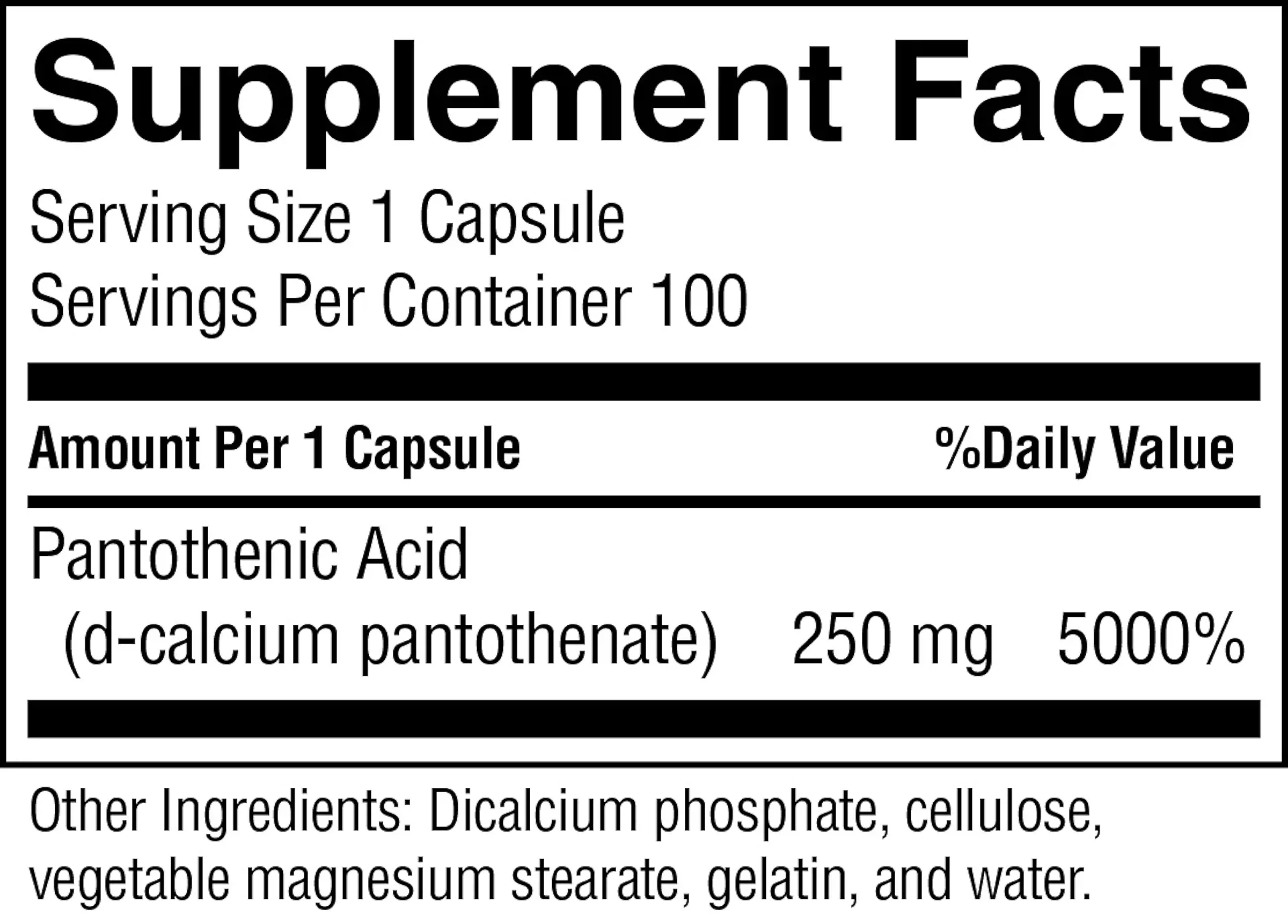- Provides 250 mg pantothenic acid per capsule.