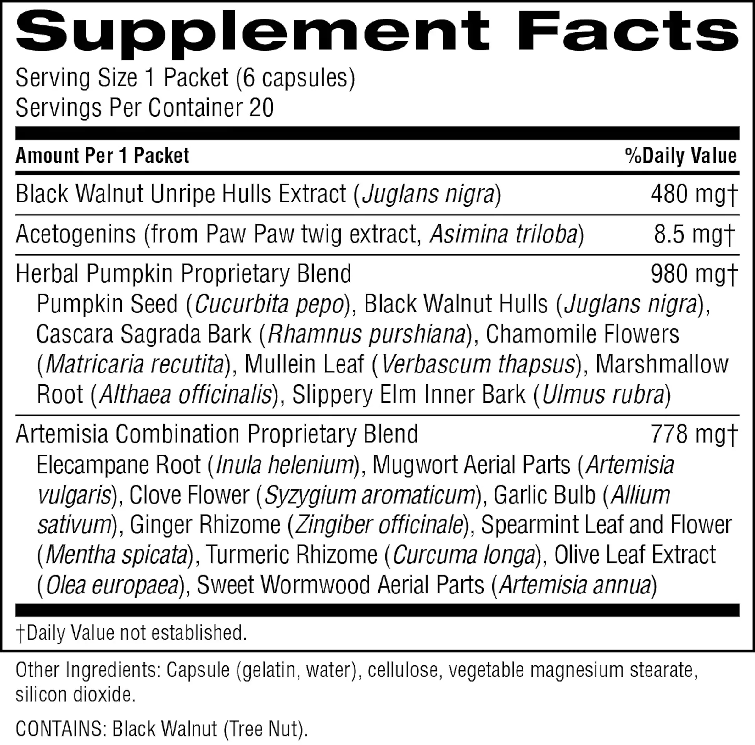 Each cello packet contains one capsule of Paw Paw Cell-Reg, two capsules of Herbal Pumpkin, one capsule of Black Walnut ATC Concentrate and two capsules of Artemisia Combination