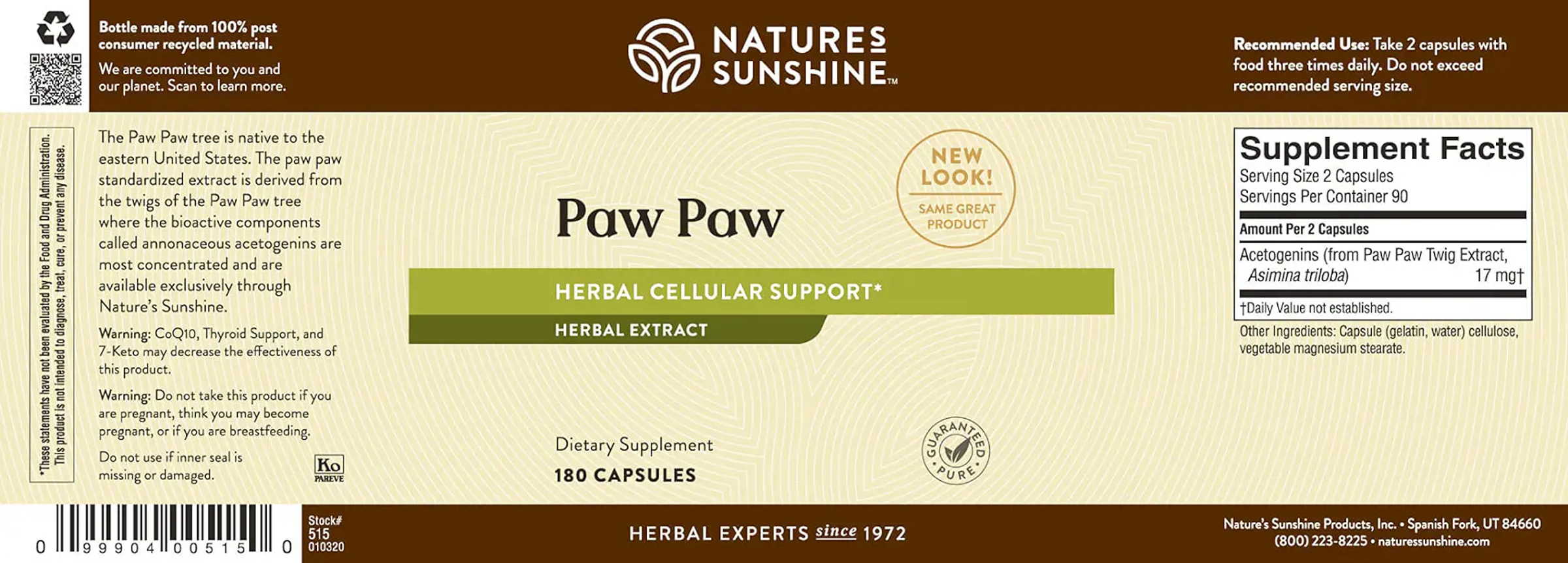Nature’s Sunshine pioneered the use of paw paw trees for the immune system. Carefully analyzed before its release, Paw Paw was found to have highly concentrated levels of acetogenins. These compounds have the ability to modulate the production of energy in cells. Our wild-crafted trees grow in nutrient-rich soil in the central US where they are harvested using methods that provide for maximum sustainability. Our Paw Paw is non-GMO verified and Kosher-certified.