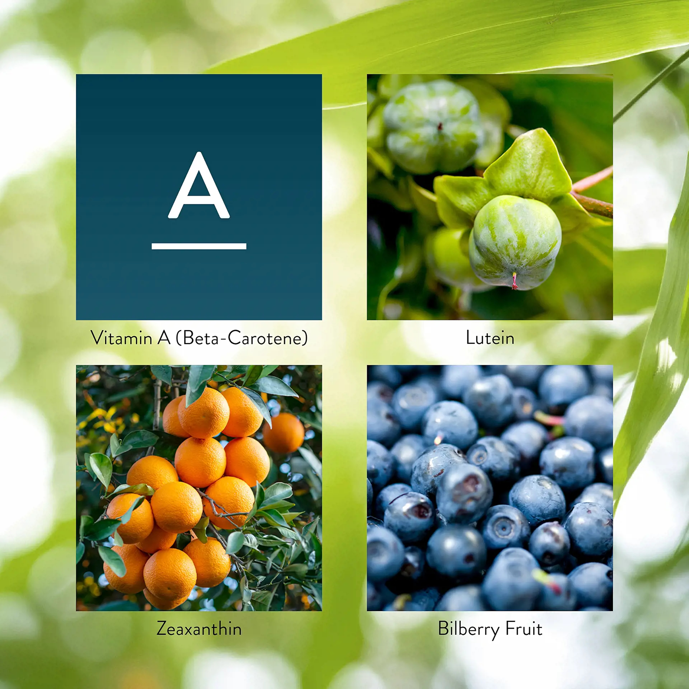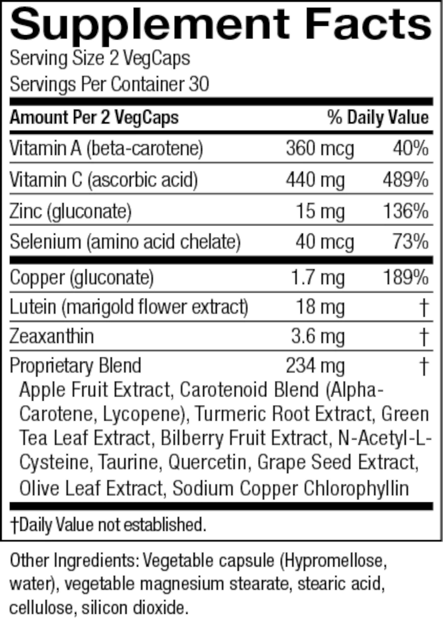 Vitamin A (beta-carotene), Vitamin C (ascorbic acid), zinc (gluconate), selenium (amino acid chelate), copper (gluconate), lutein (marigold flower extract), zeaxanthin, apple fruit extract, carotenoid blend (alpha-carotene, lycopene, cryptoxanthin), turmeric root extract (Curcuma longa), green tea leaf extract, bilberry fruit extract, N-acetyl cysteine, taurine, quercetin, grape seed extract, olive leaf extract and sodium copper chlorophyllin