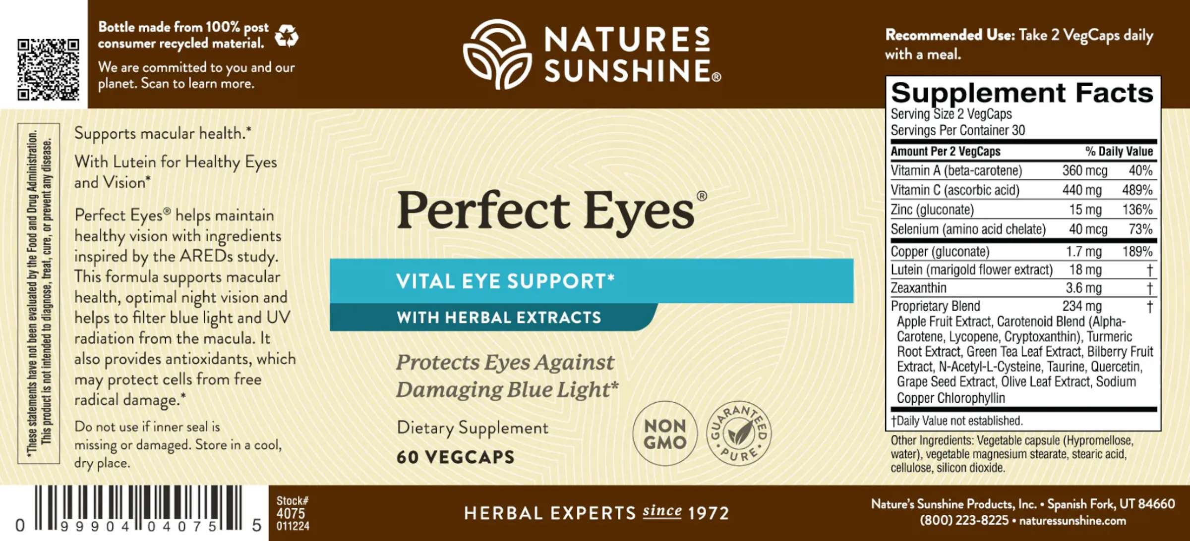Our eyes are constantly exposed to sunlight and artificial lighting, which can generate free radicals that have harmful effects on ocular cells. After middle age, our natural antioxidant production decreases, and the pigments in our eyes change. Lutein, zeaxanthin are two key ingredients in this formula that may reduce the risk of light-induced oxidative damage that could lead to age-related macular degeneration. These two nutrients benefit eye health by blocking blue light from reaching the underlying structures in the retina. Perfect Eyes® includes Vitamin A (beta-carotene), Vitamin C, zinc, selenium, copper, lutein and zeaxanthin ingredients inspired by the AREDS study (age-related eye disease study) that supports eye health and maintains healthy vision.