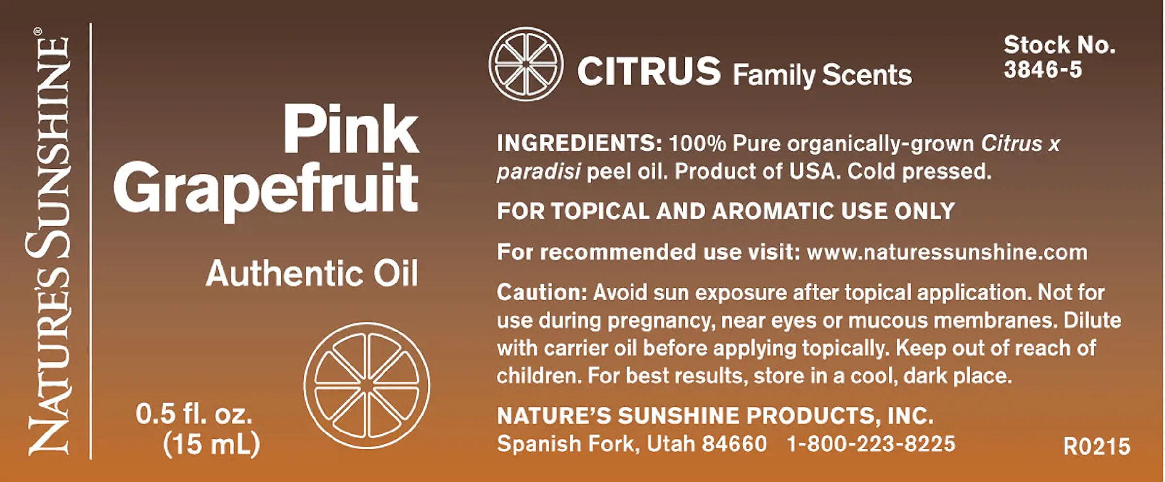 Essential oils may be used aromatically or topically in a variety of ways including diffusers, massage, compresses, baths, scrubs, lotions and sprays. Essential oils should be diluted with Nature’s Sunshine Massage Oil or Carrier Oil before applying topically. Pink Grapefruit oil can be photosensitizing. Avoid sun exposure after topical application.