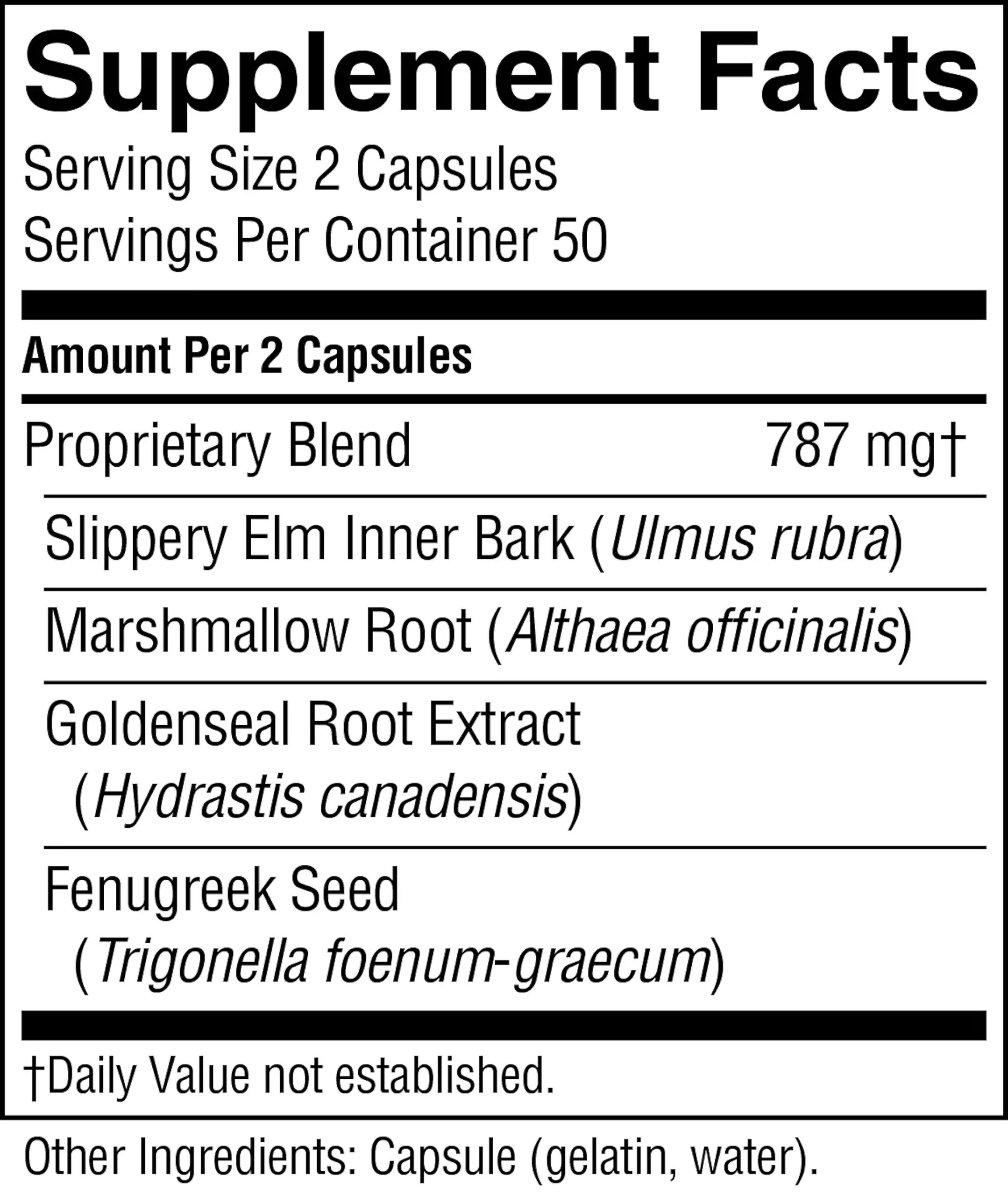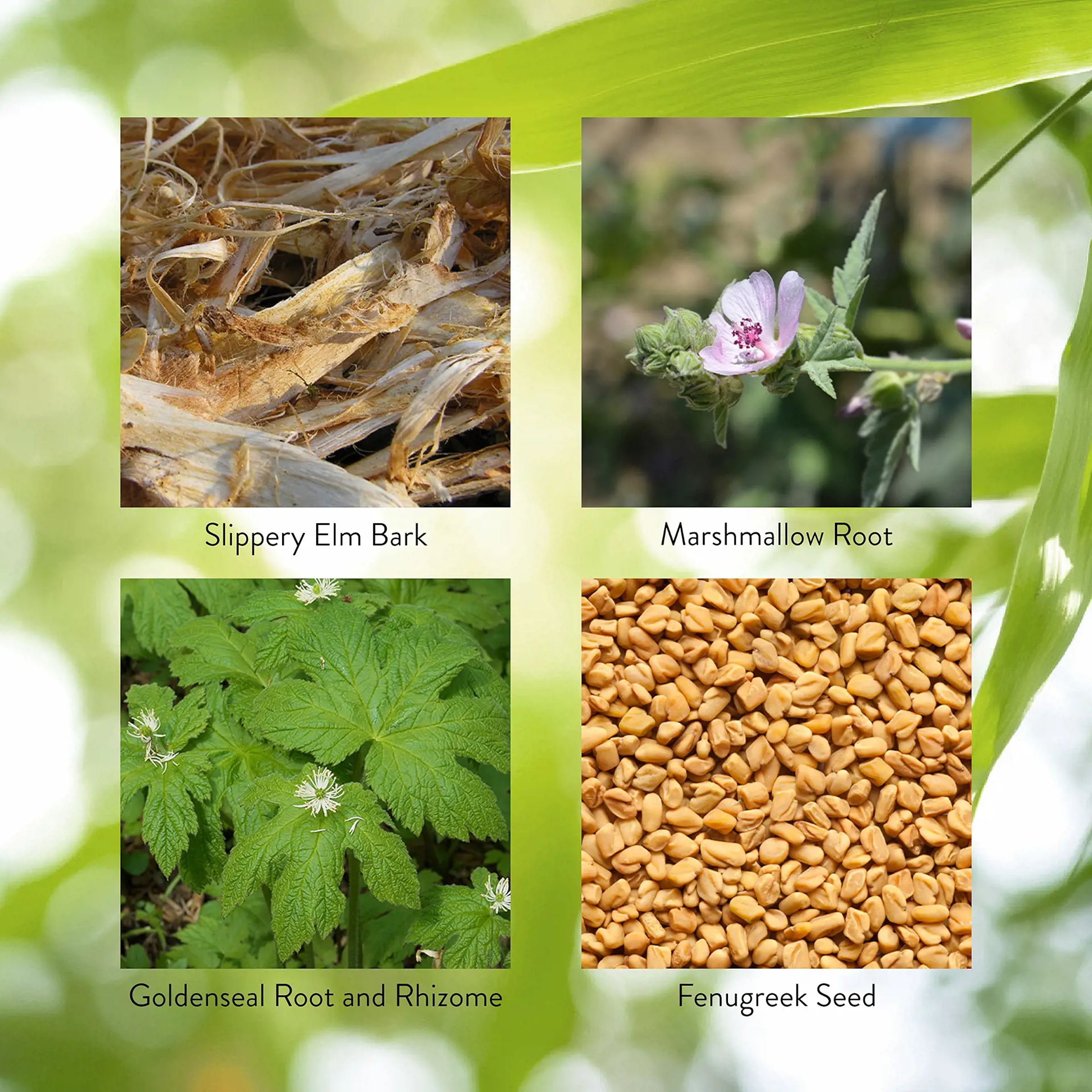 Slippery elm bark, marshmallow root, goldenseal root and rhizome, fenugreek seed.