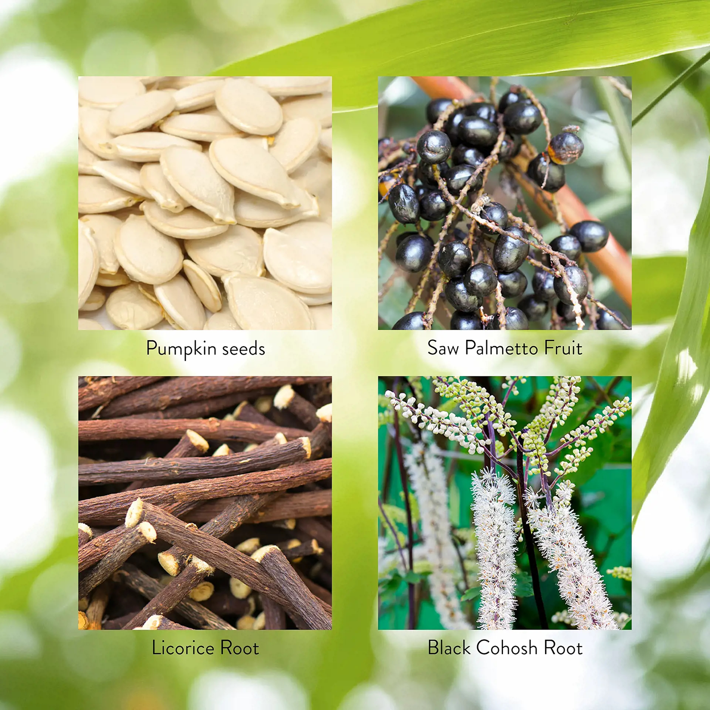 Pumpkin seeds, saw palmetto fruit, licorice root, black cohosh root, gotu kola aerial parts, capsicum fruit, golden seal root extract and rhizome, ginger rhizome, dong quai root, lobelia aerial parts, and kelp leaves and stem.
