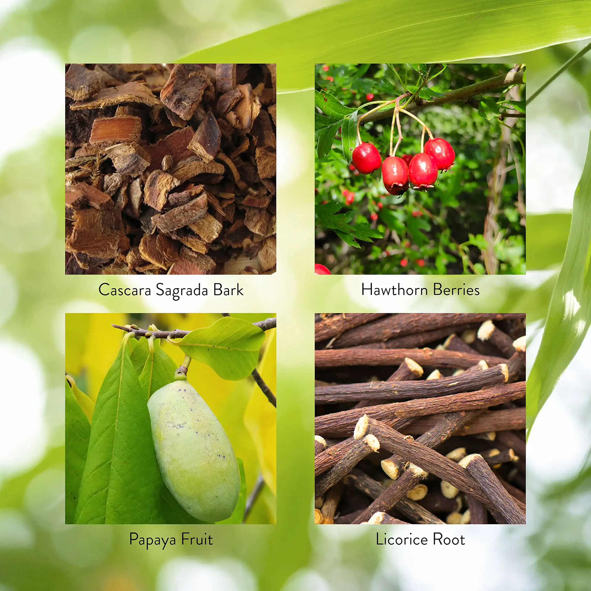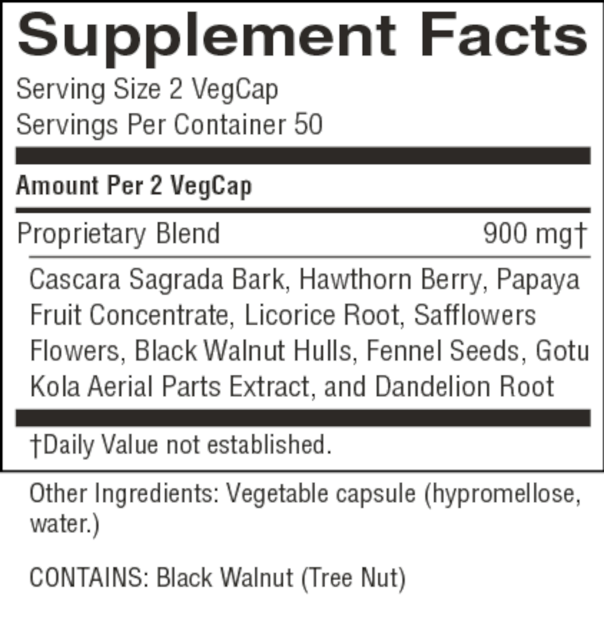 Cascara sagrada bark, hawthorn berries, papaya fruit, licorice root, safflower flowers, black walnut hulls, chickweed leaf extract, fennel seeds, parthenium root, gotu kola aerial parts and dandelion root.