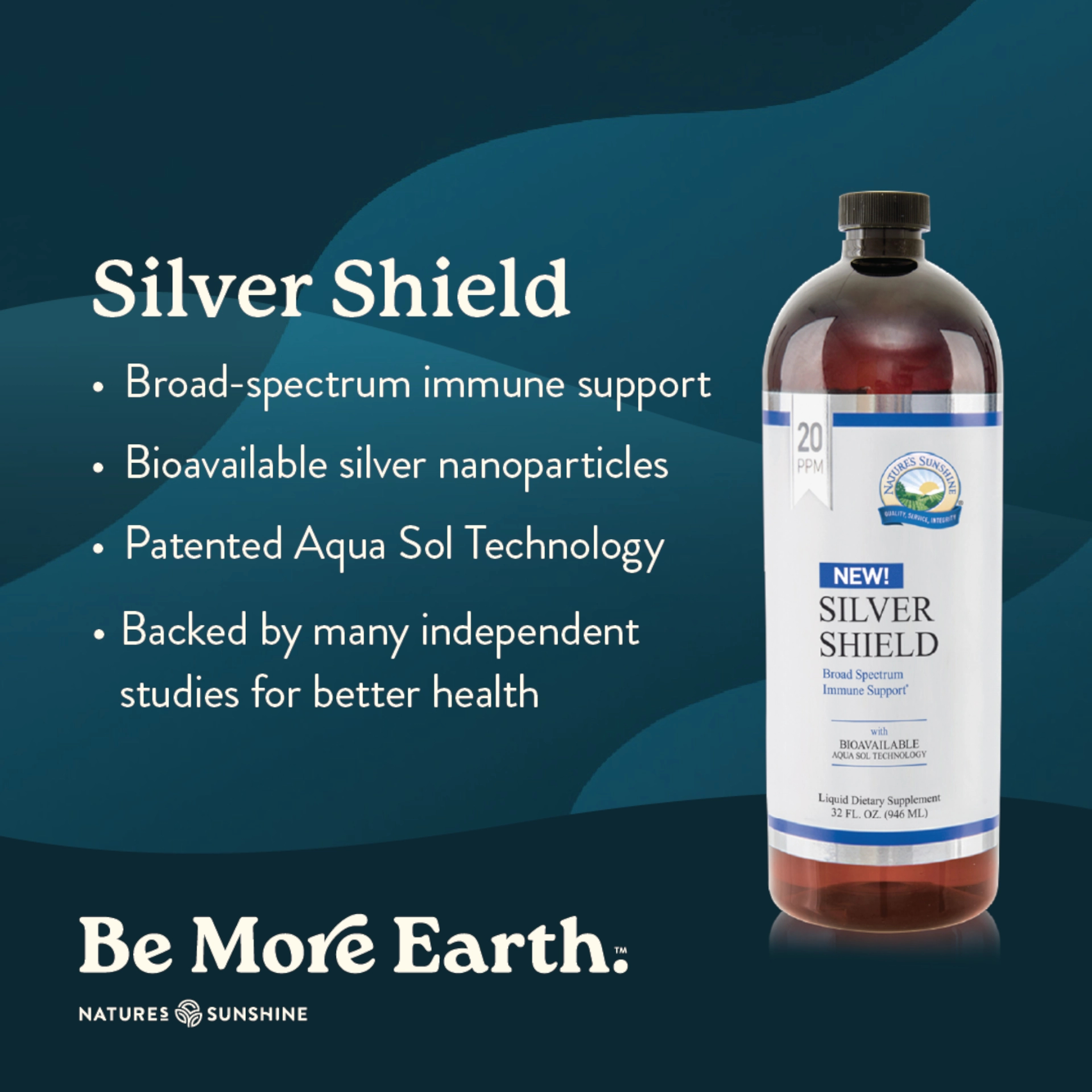 Silver Shield with Aqua Sol Technology features pure silver particles suspended in pure water for powerful support. It is manufactured using a patented process with strict quality control to verify potency and purity. The result is fine, bioavailable, particle-sized colloids.