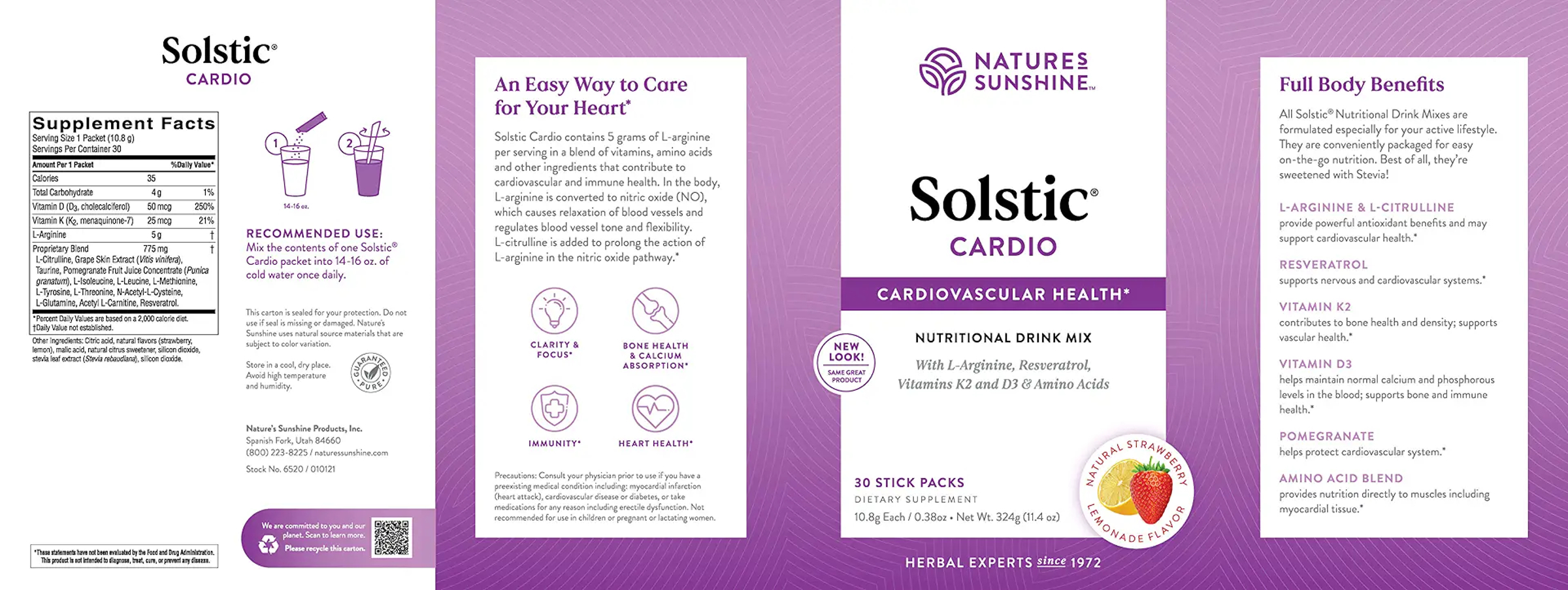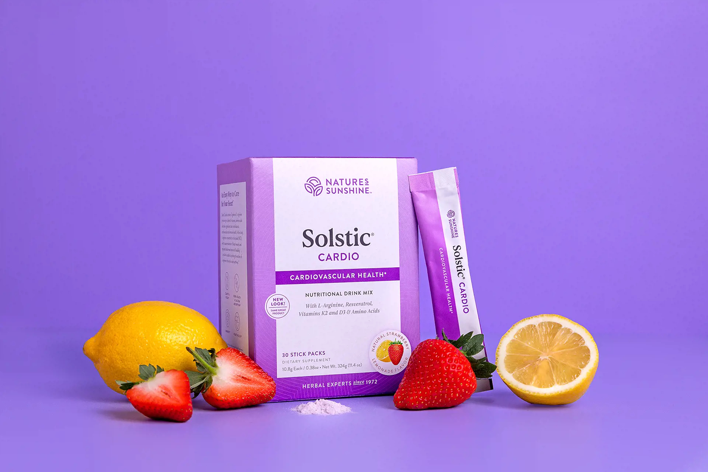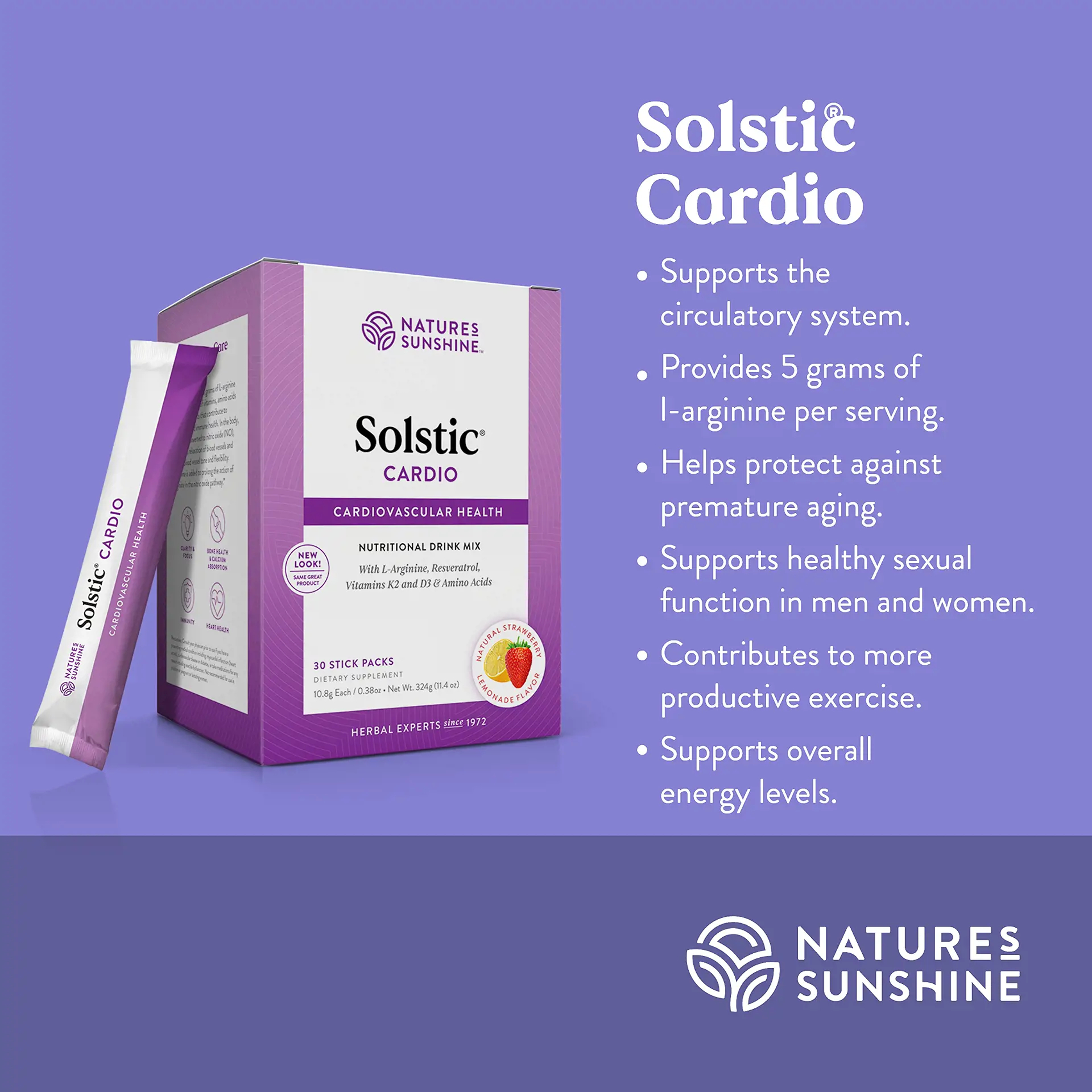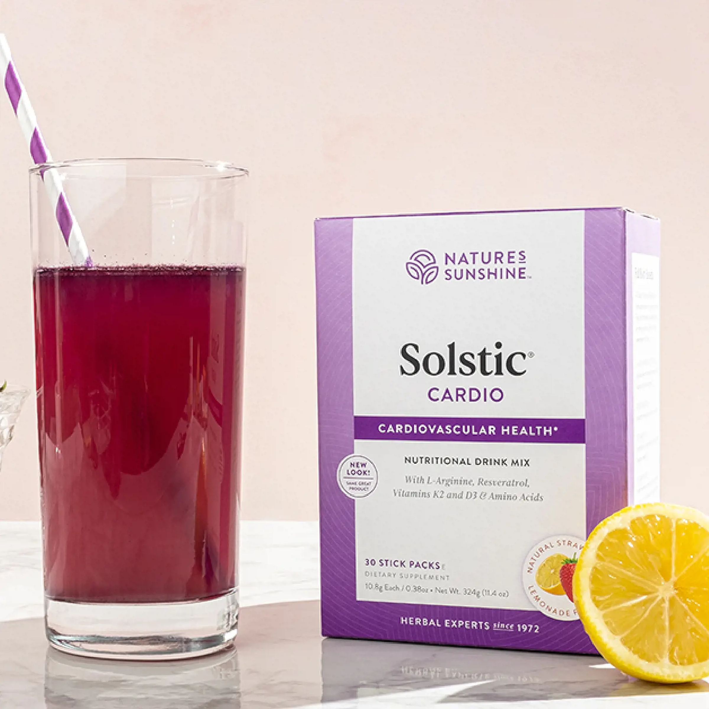 NSP Solstic® Cardio is a convenient drink packet that offers daily nutrition for your cardiovascular system. Solstic® Cardio is formulated to provide maximum benefit to the cardiovascular system. It contains 5 grams of l-arginine per serving in a blend of minerals, amino acids and other ingredients that contribute to cardiovascular and immune health. In the body, l-arginine is converted to nitric oxide, which causes relaxation of blood vessels and regulates blood vessel tone and flexibility. L-citrulline is added to prolong the action of l-arginine in the nitric oxide pathway. Solstic® Cardio also contains resveratrol (a powerful antioxidant that supports the cardiovascular system), vitamin K2 (contributes to bone health and facilitates calcium absorption), vitamin D3 (supports immune function, mood and bone health, and helps maintain normal calcium and phosphorous levels in the blood), pomegranate (may support cardiovascular function) and an amino acid blend. Solstic® Cardio is flavored with natural strawberry and lemon powders.