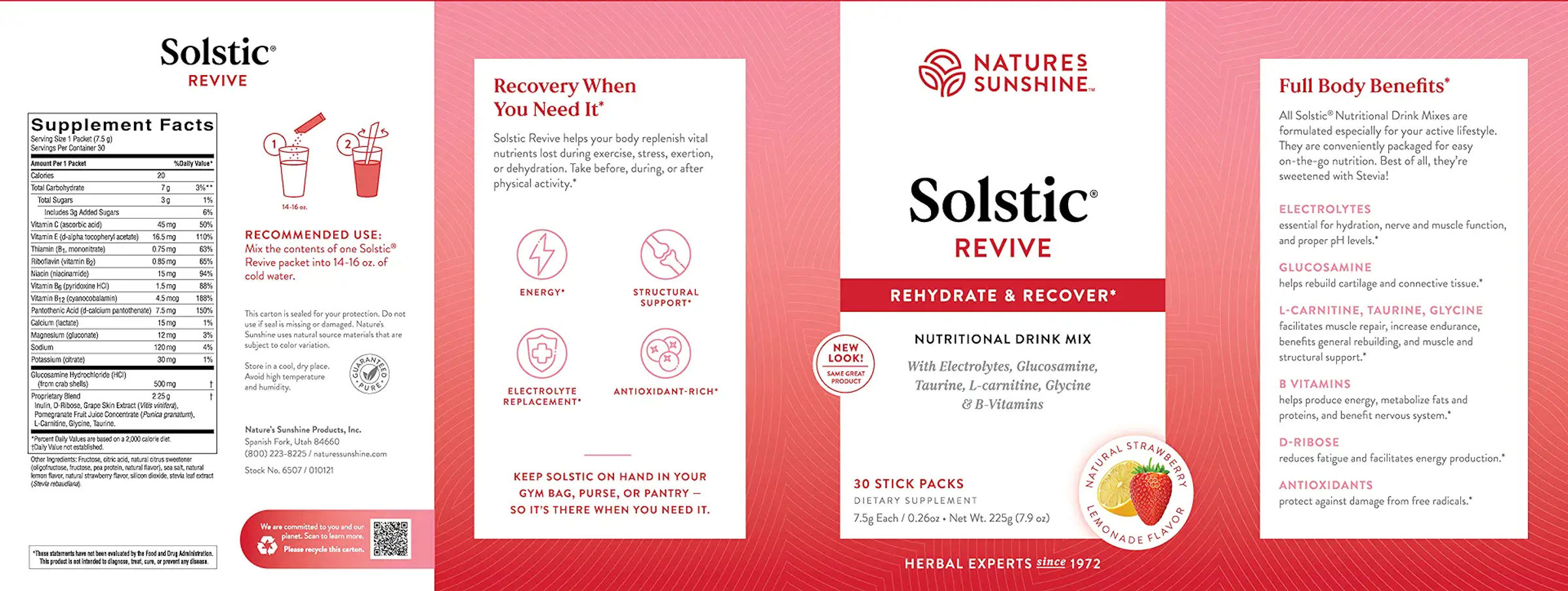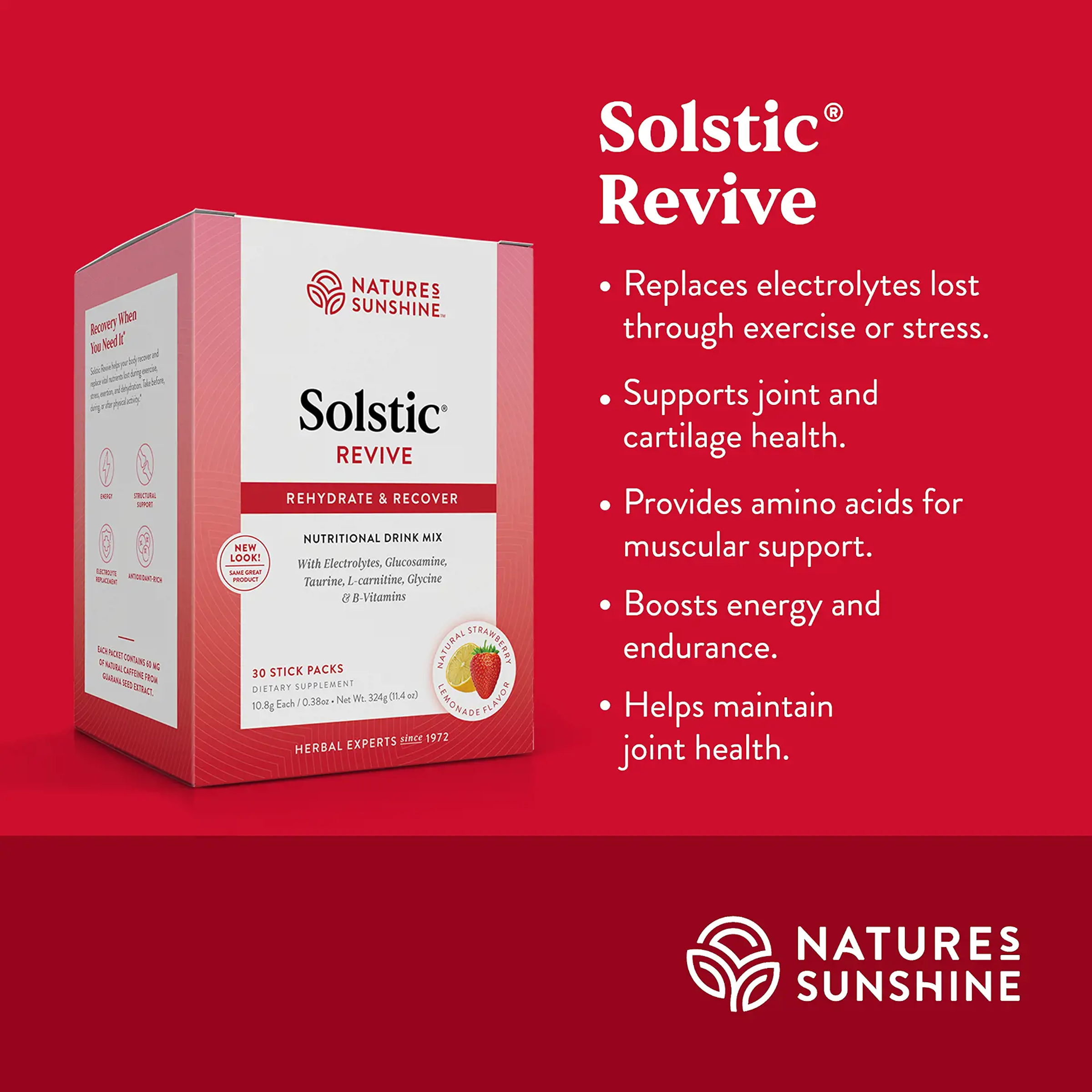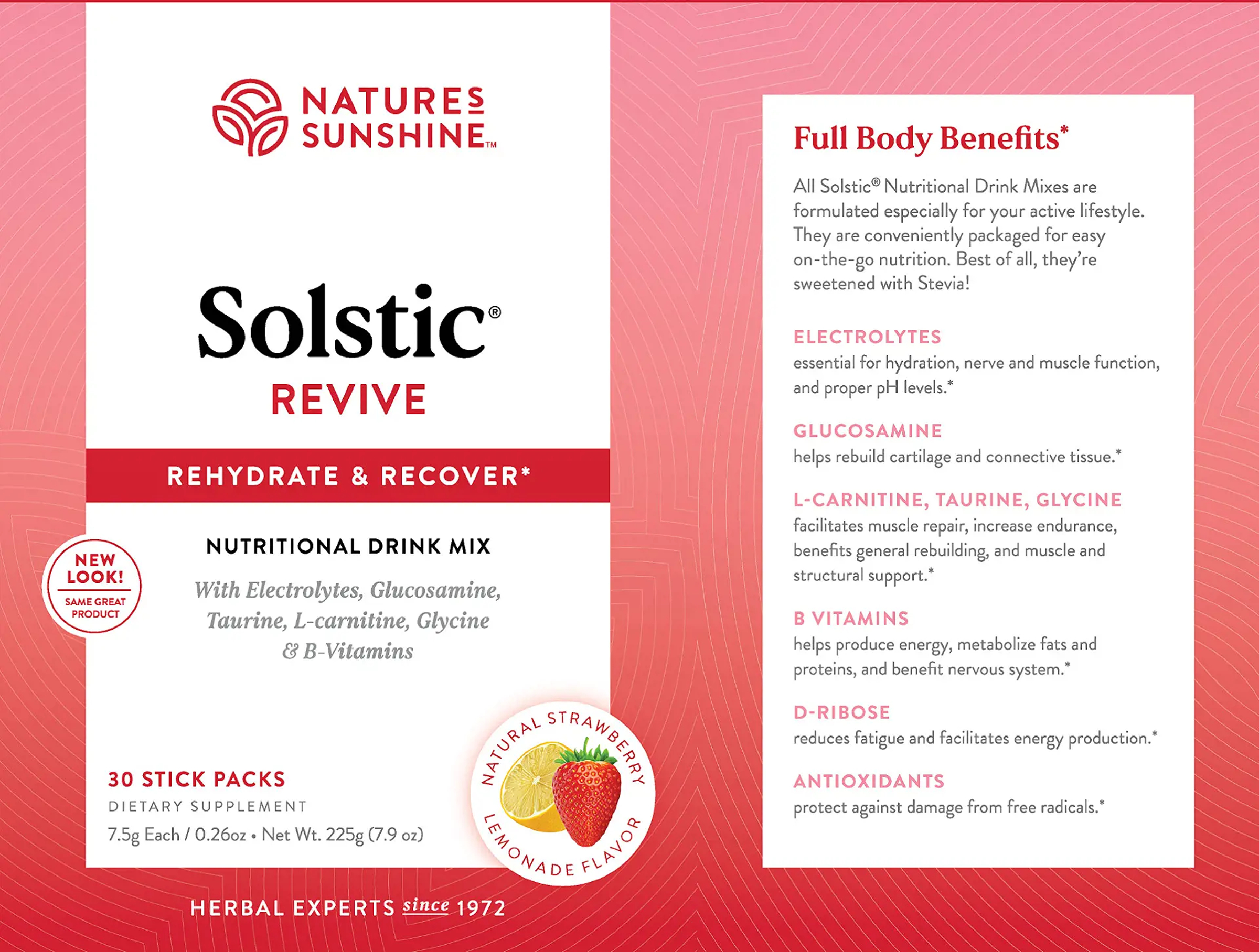Solstic® Revive replaces vital nutrients—including calcium, magnesium, sodium and potassium—lost during exercise, stress, exertion, dehydration and malnutrition. Revive is perfect for before, during and after any strenuous activity or as a refreshing beverage anytime throughout the day. Solstic® Revive contains 500 mg glucosamine per serving to help support joint and cartilage health; electrolytes, essential for hydration, nerve and muscle function and proper pH levels; the amino acids l-carnitine, l-taurine and l-glycine to facilitate muscle repair, increase endurance, aid general rebuilding and offer muscle and structural support; and B vitamins, which help produce energy, metabolize fats and proteins, and benefit the nervous system.