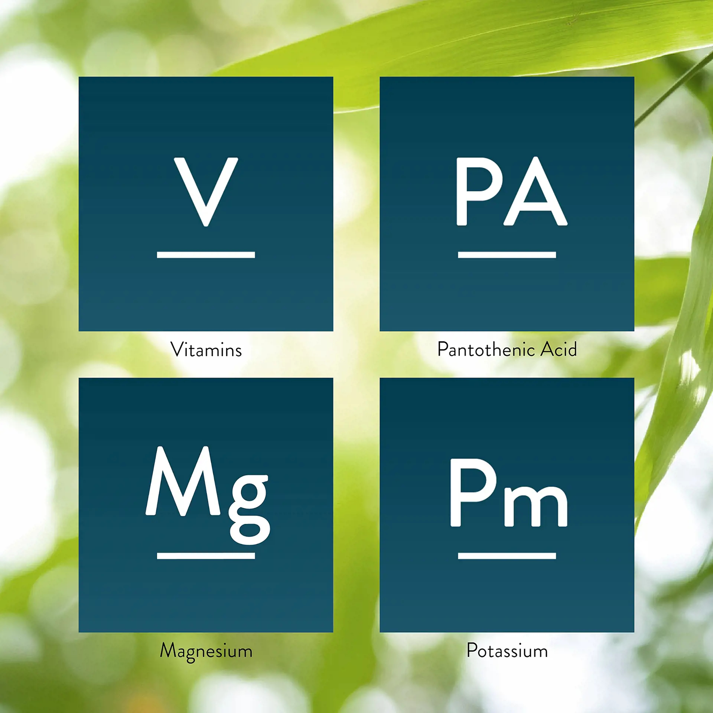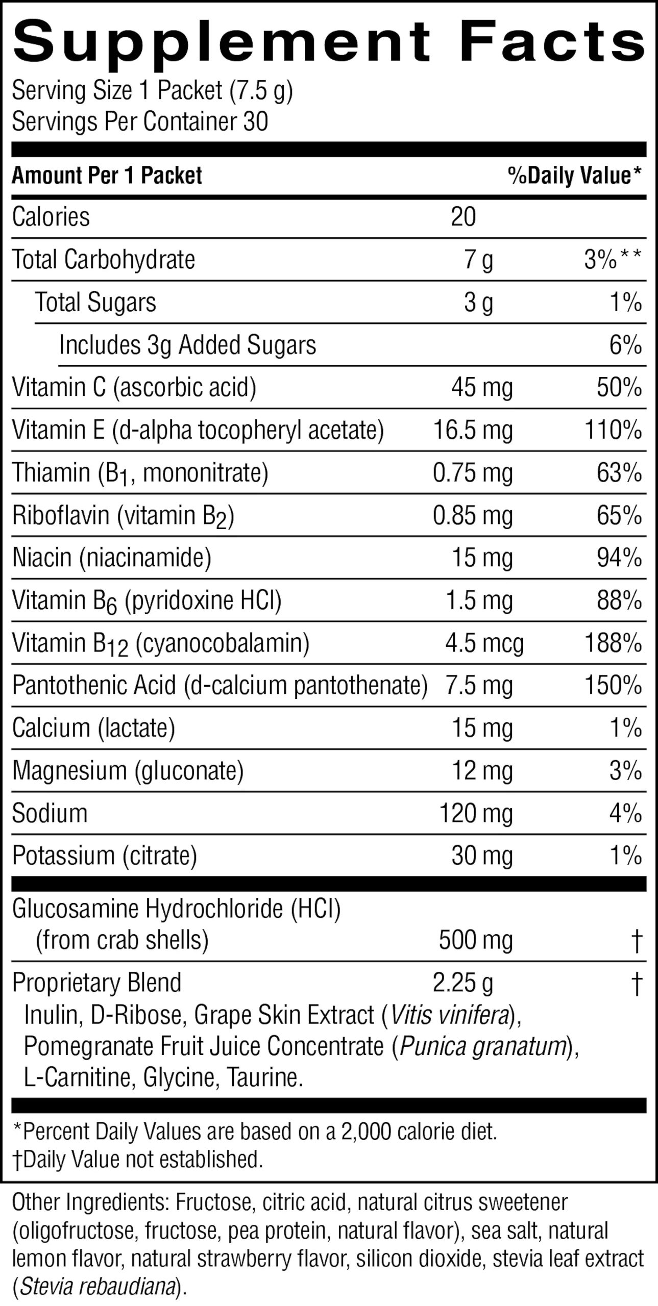 Vitamin C, vitamin E, thiamin (B1), riboflavin (B2), niacin, vitamin B6, vitamin B12, pantothenic acid, calcium, magnesium, sodium, potassium, glucosamine, fructose, chicory root fiber, d-ribose, natural citrus sweetener, sea salt, natural flavors, stevia leaf extract, grape skin extract, pomegranate fruit juice concentrate, l-carnitine, l-taurine and l-glycine