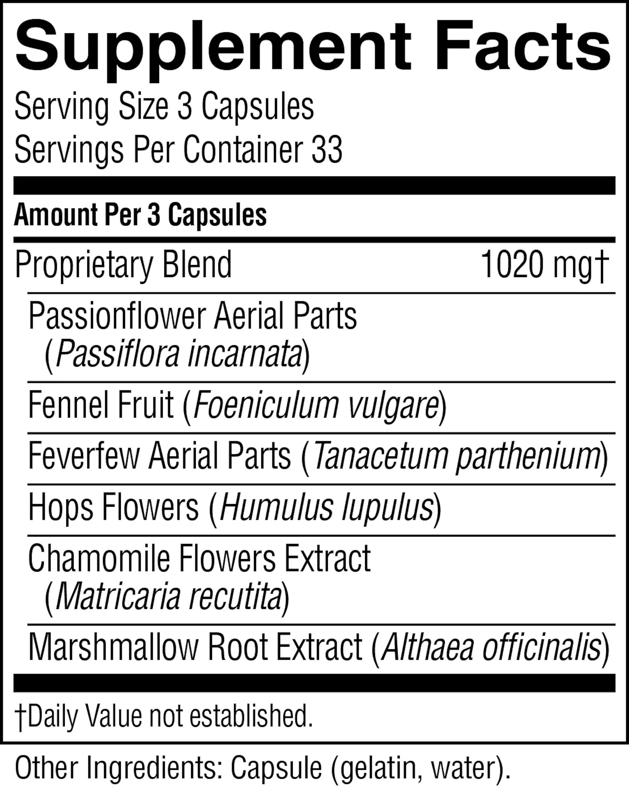 Passionflower aerial parts, fennel seeds, feverfew aerial parts, hops flowers, chamomile flowers extract and marshmallow root extract