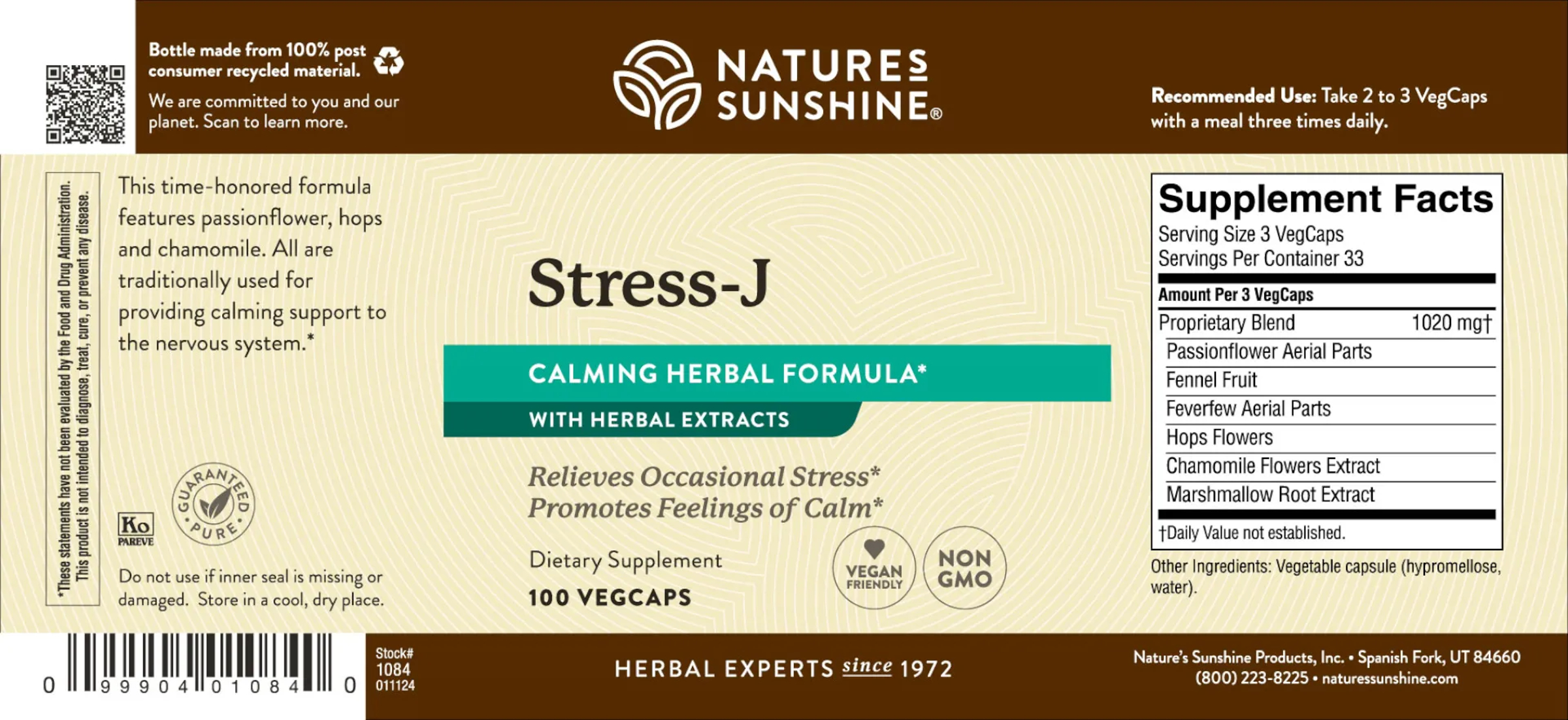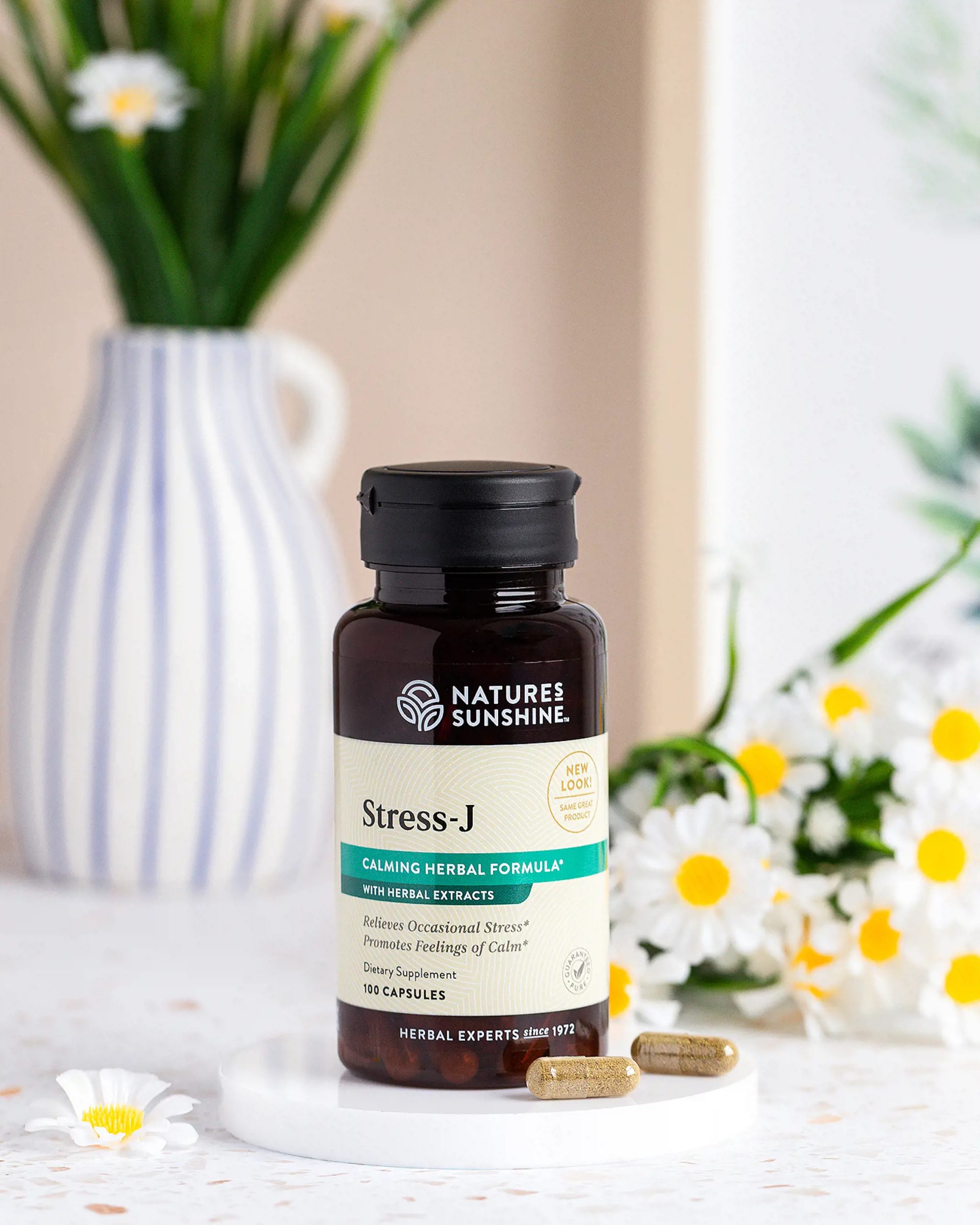 Developed in partnership with a genuine American herbalist, the late Jeanne Burgess, Stress-J has been popular for decades and has been proven over time. Each ingredient in this formula works in harmony with other herbs to offer valuable nervous system support. And the option of having a natural, herbal formula to help with stress strikes a positive chord with many health enthusiasts. Top it all off with awesome ingredients for a feel-good way to feel good! Like chamomile flowers grown wild on the prairies and in meadows where expert harvesters pick them by hand. They’re organic, Kosher and processed only with pure water – never any solvents.