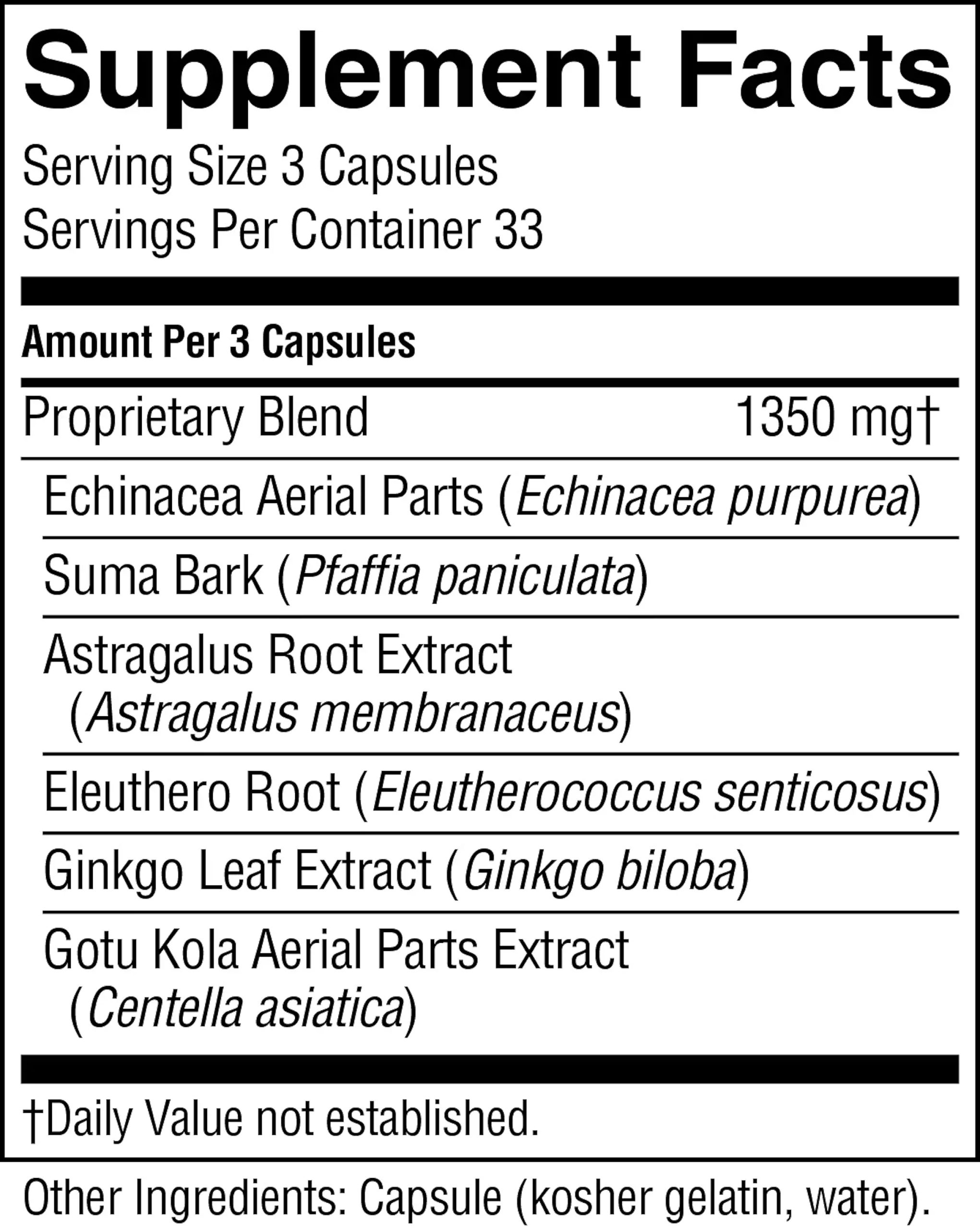 Echinacea aerial parts, suma bark, astragalus root, eleuthero root, ginkgo leaves concentrate, and gotu kola root and rhizome concentrate.