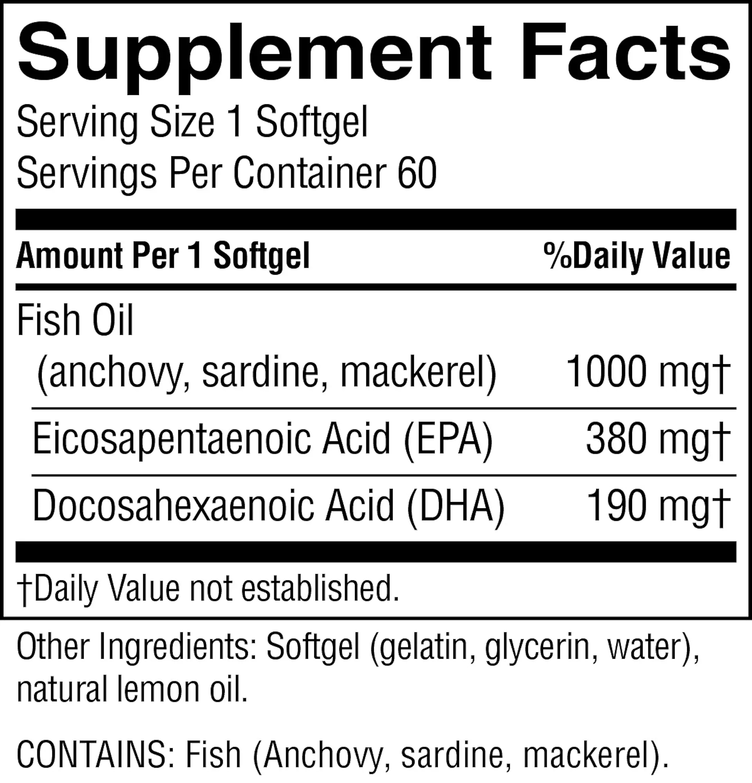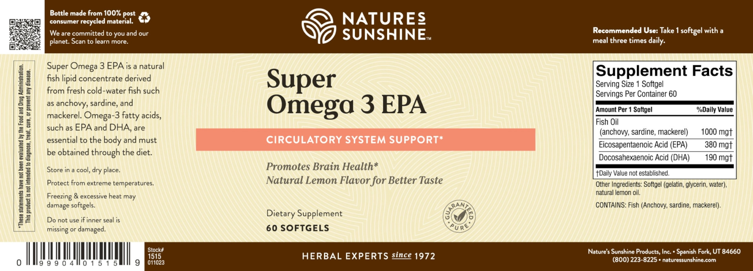 Omega-3 fatty acids are one of four basic fats that the body derives from foods. While many of the other fats are harmful, omega-3s benefit the body and are especially good for the heart. Super Omega-3 EPA is a source of two fatty acids, EPA and DHA. Each softgel contains approximately 1,000 mg fish oil, with a ratio of 33:16 EPA to DHA (380 mg EPA, 190 mg DHA). It also contains lemon to significantly reduce the aftertaste from fish oil and to reduce gas.