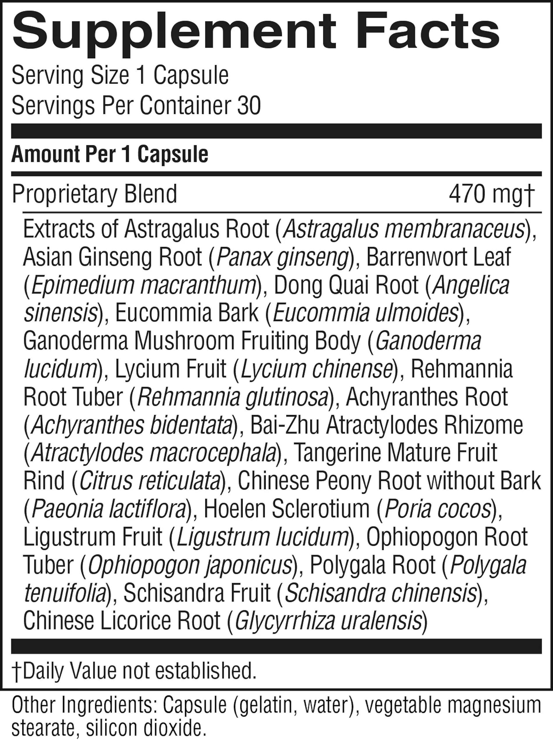 Concentrated extract of astragalus root, ginseng root, epimedium leaf, eucommia bark, ganoderma mushroom, lycium fruit, rehmannia root tuber, achyranthes root, tang-kuei root, atractylodes rhizome, citrus peel, hoelen sclerotium, ligustrum fruit, ophiopogon root tuber, peony root without bark, polygala root, schizandra fruit and licorice root