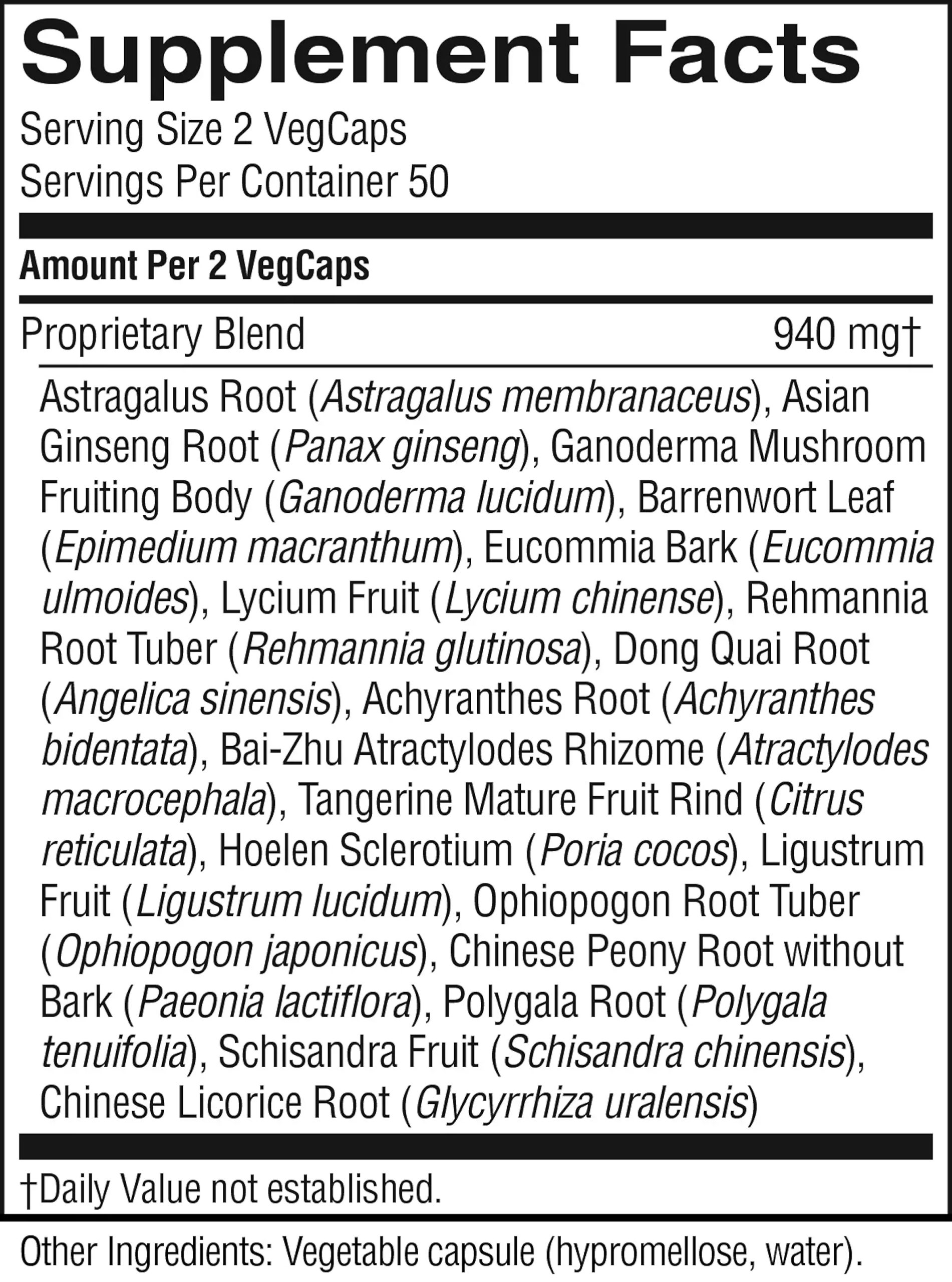 Astragalus root, ginseng root, epimedium leaf, eucommia bark, ganoderma mushroom, lycium fruit, rehmannia root tuber, achyranthes root, tang-kuei root, atractylodes rhizome, citrus peel, hoelen sclerotium, ligustrum fruit, ophiopogon root tuber, peony root without bark, polygala root, schizandra fruit and licorice root.