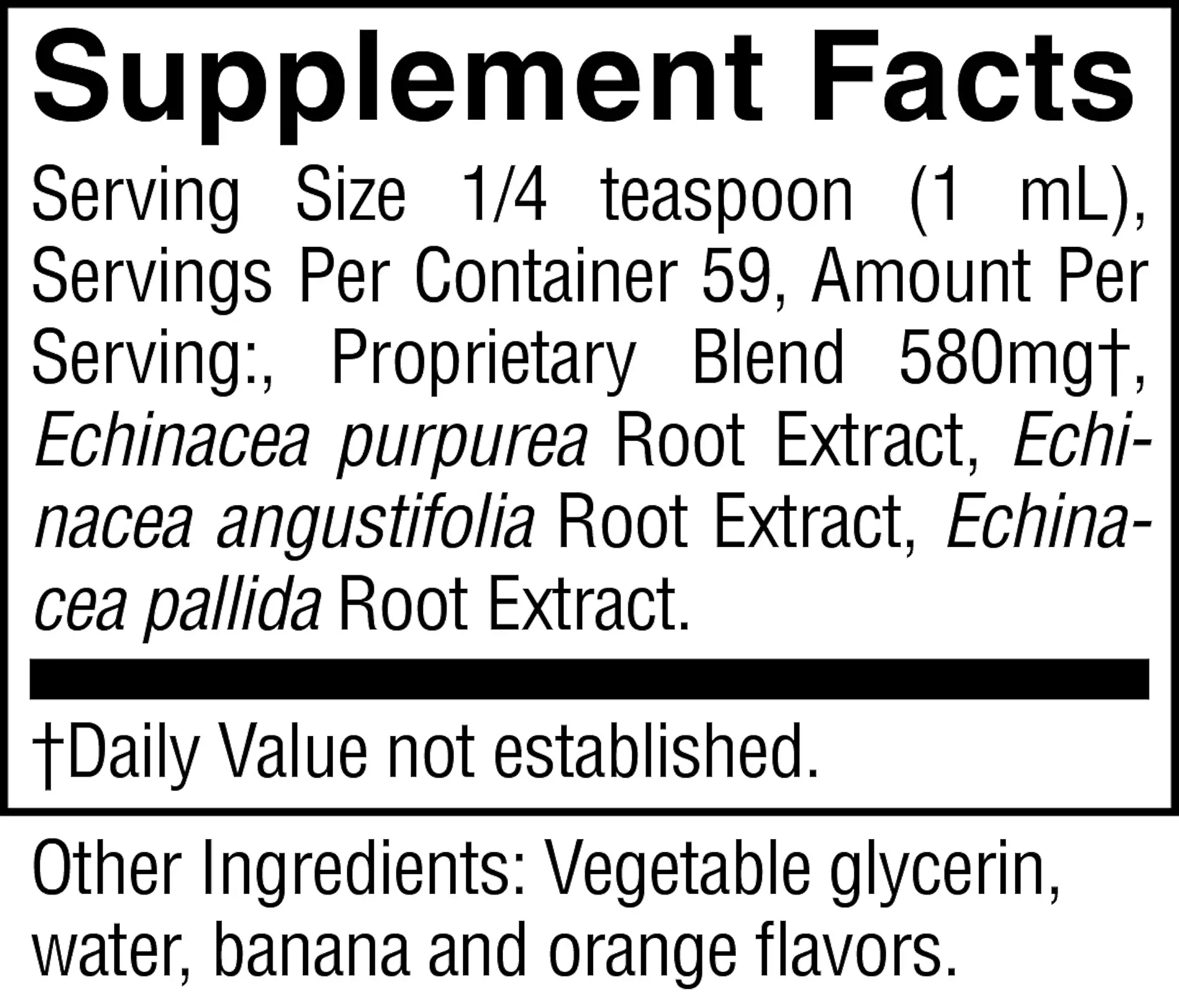 Extract from the roots of Echinacea purpurea, E. angustifolia and E. pallida, banana and orange flavor, vegetable glycerin and water