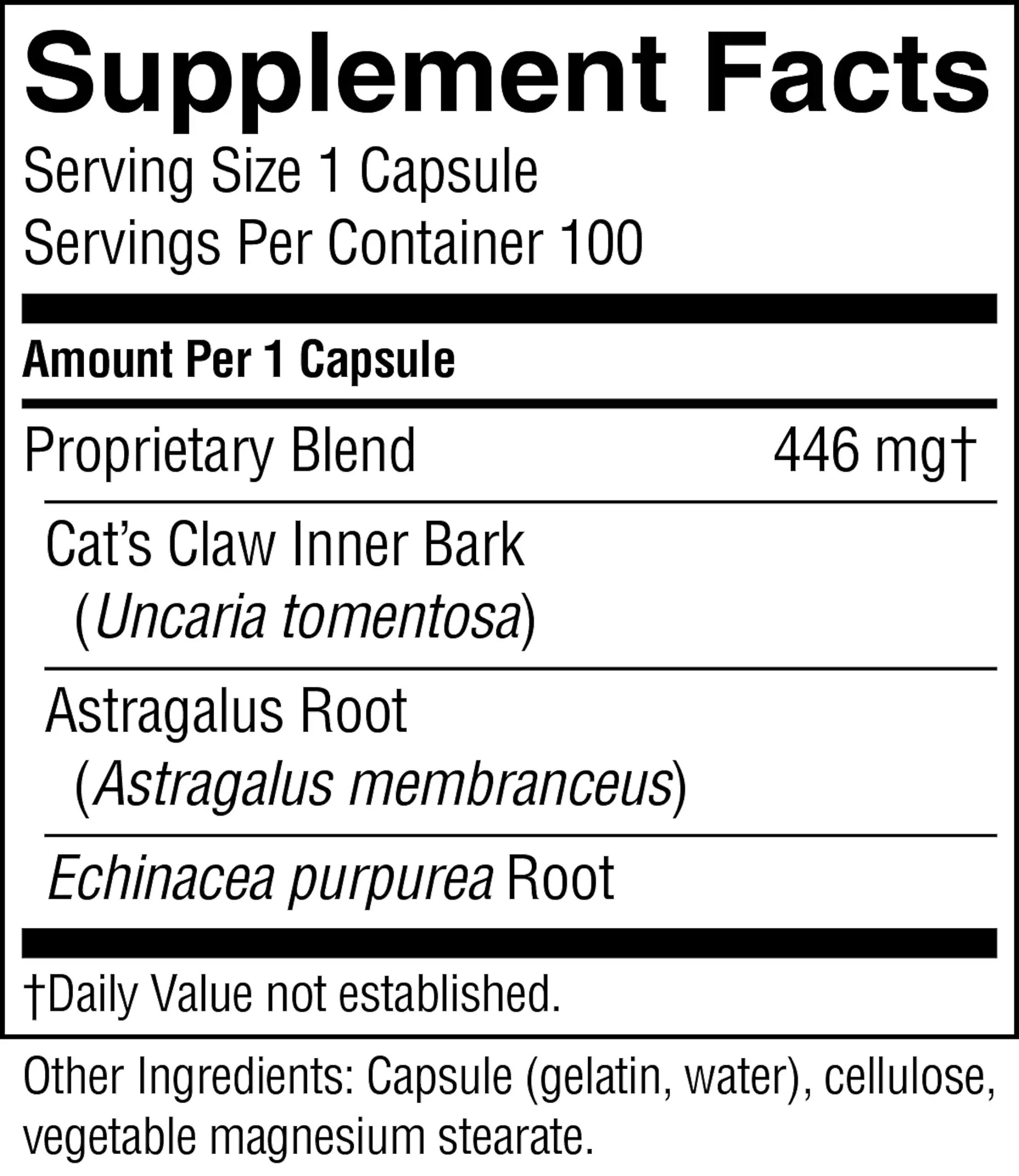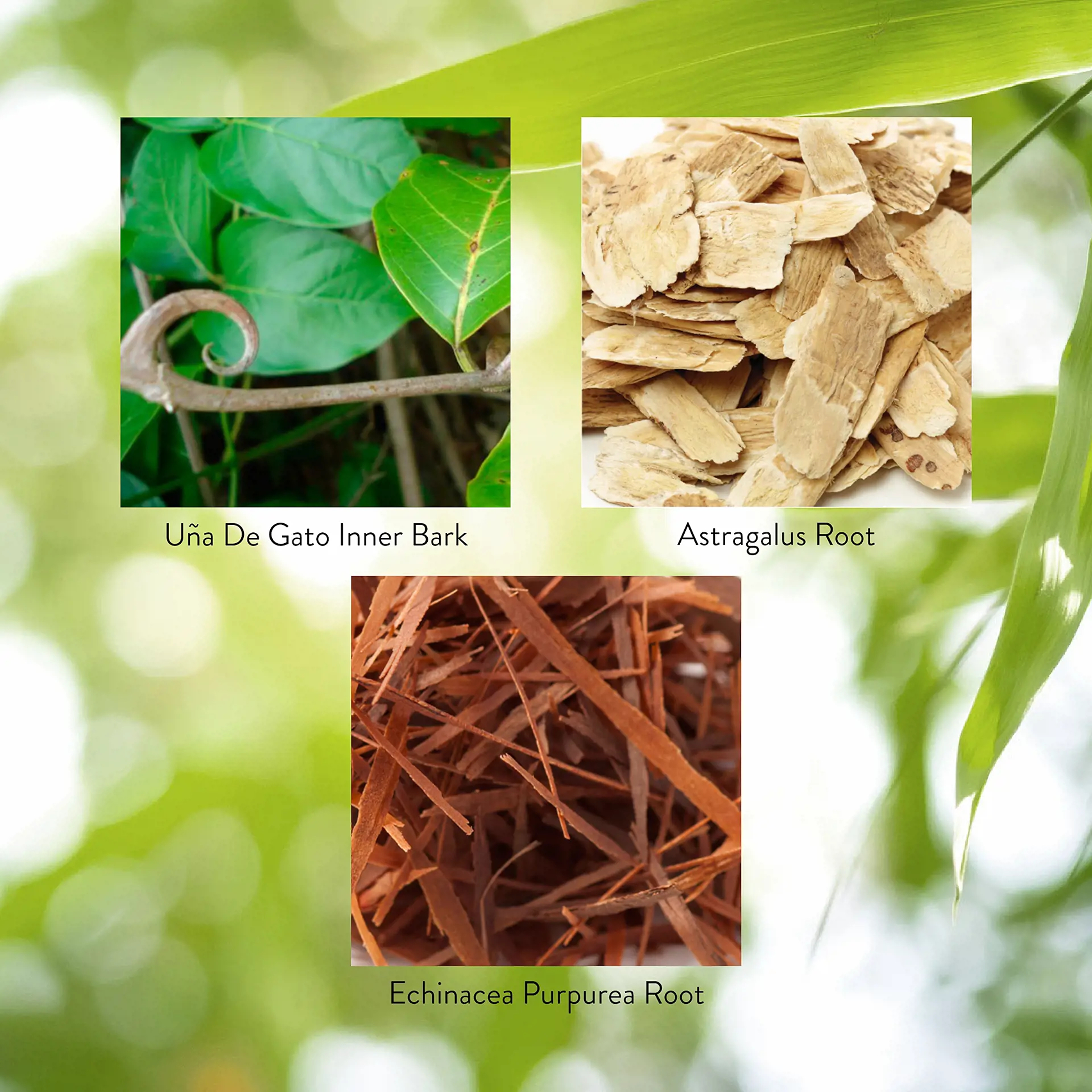 Uña de gato inner bark, astragalus root and Echinacea purpurea root.