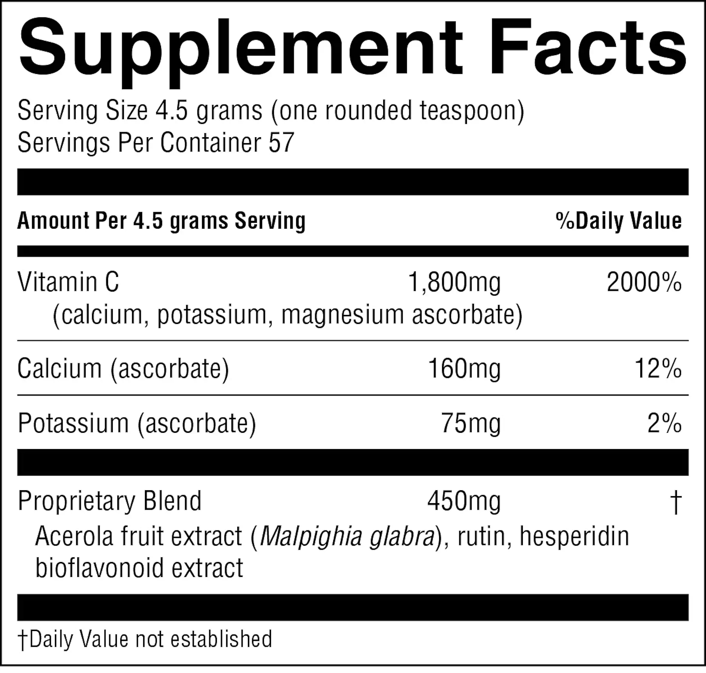 1,800 mg Vitamin C per serving, plus calcium, potassium and magnesium ascorbates; acerola fruit extract; rutin and hesperidin bioflavonoid extract.