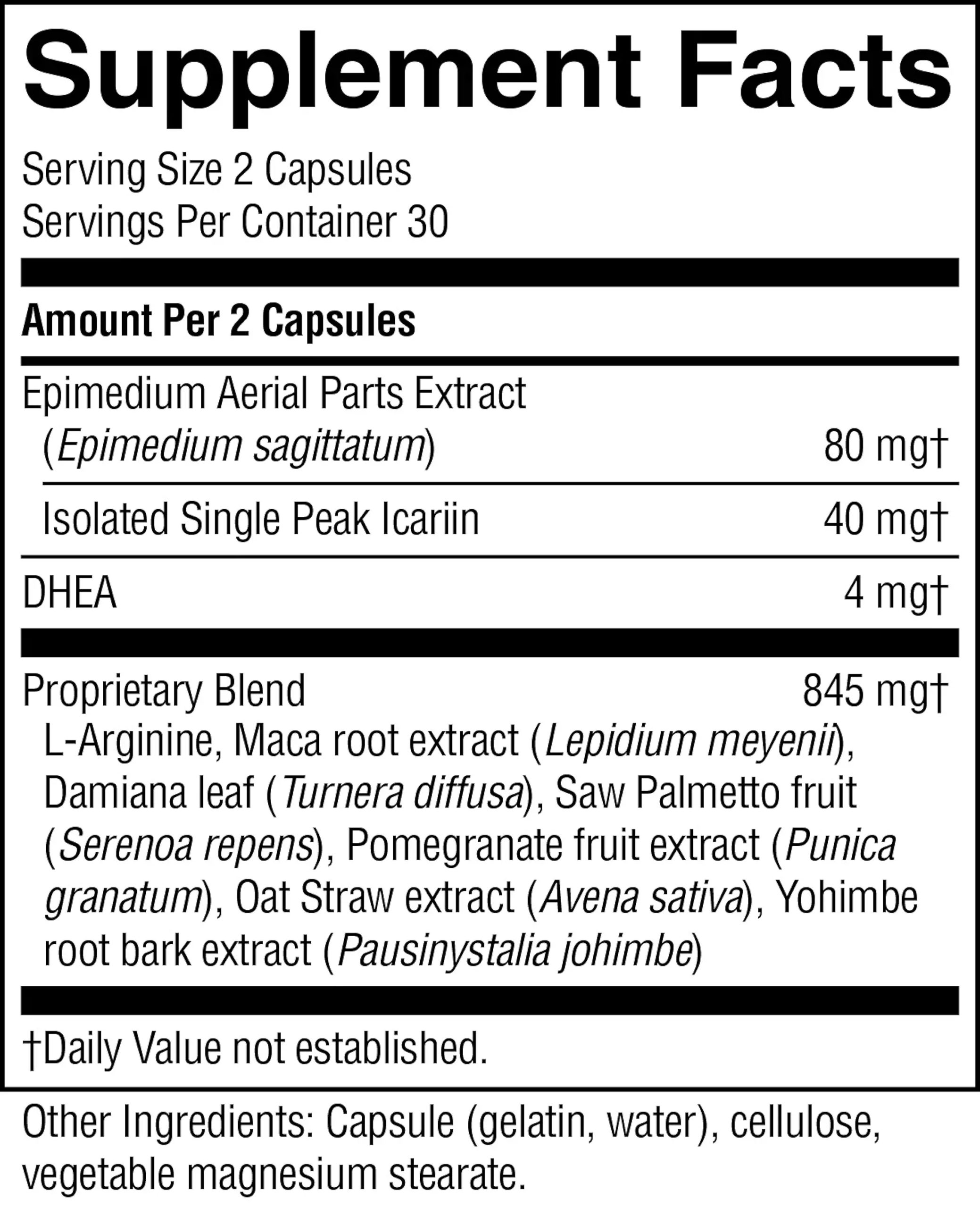 L-arginine, damiana leaf, oat straw extract, saw palmetto fruit, epimedium leaf extract standardized to icariin content, maca root extract, pomegranate fruit extract, yohimbe root bark extract and DHEA