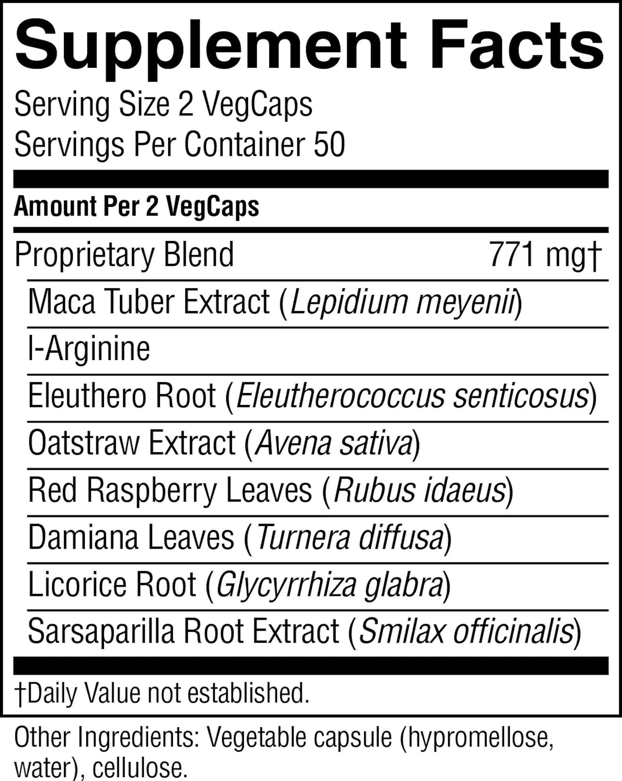 Maca root extract, l-arginine, eleuthero root, oat straw extract, red raspberry leaves, damiana leaves, licorice root and sarsaparilla root.