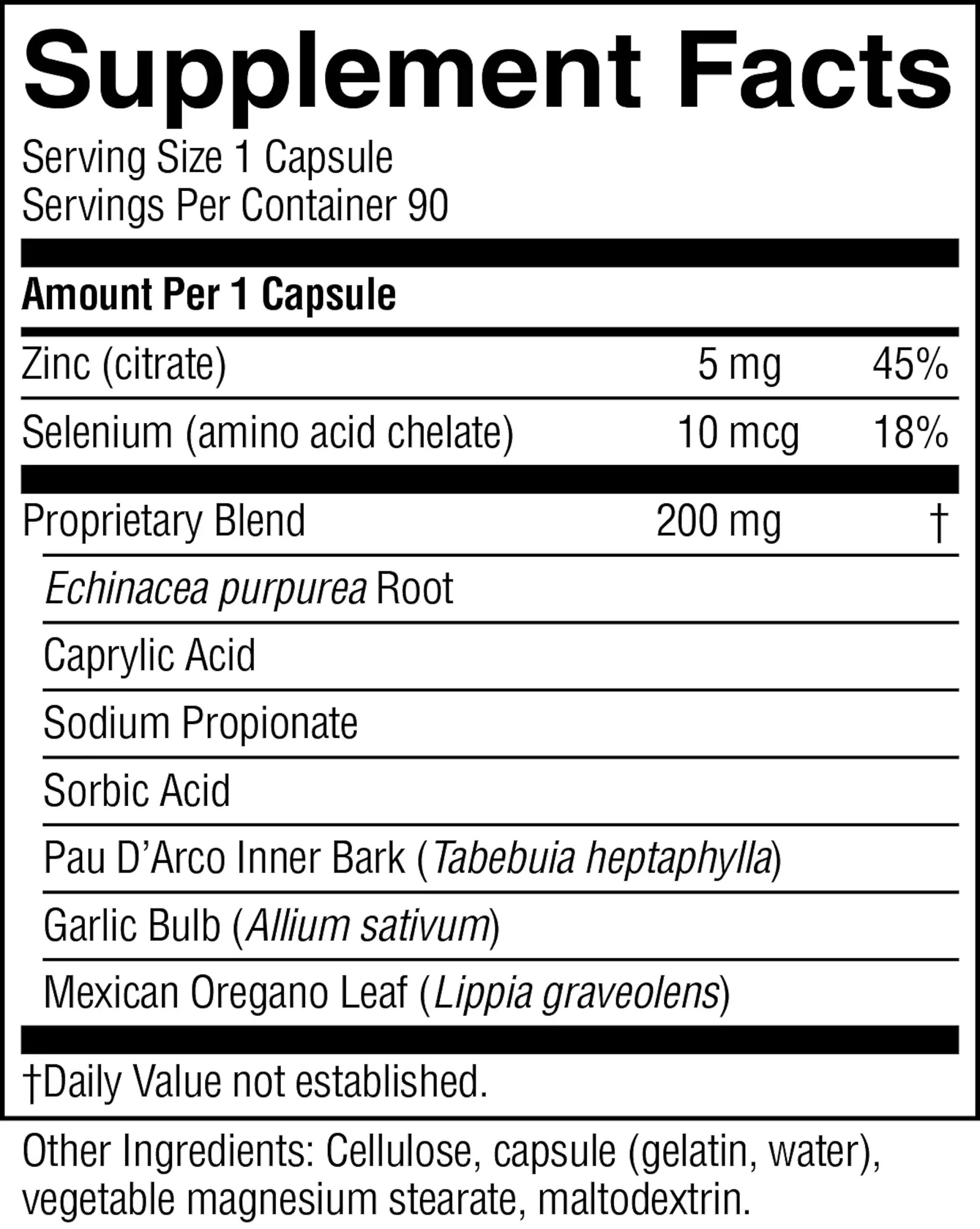 Selenium, zinc, Echinacea purpurea root, caprylic acid, sodium propionate, sorbic acid, pau d’arco inner bark, garlic bulb and oregano leaf